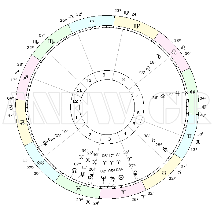 | | ΘΕΣΕΙΣ ΠΛΑΝΗΤΩΝ ΑΣΤΡΟΛΟΓΙΚΟΥ ΧΑΡΤΗ ΤΗΣ ΣΤΙΓΜΗΣ ΑΥΤΗΣ | | | | Πλανήτης | Ζώδιο | Μοίρες | Δεκαήμ. | Σε οίκο | Απόκλιση | | Ακμές των οίκων | | Ηλιος | Κριός | 08°14' | Πρώτο | 4 | 03 N 16 | | 1ος | 12°23' | Τοξότης | | Σελήνη | Λέων | 17°59' | Δεύτερο | 8 | 17 N 12 | | 2ος | 15°33' | Αιγόκερως | | Ερμής | Ιχθείς | 11°22' | Δεύτερο | 3 | 08 S 01 | | 3ος | 23°21' | Υδροχόος | | Αφροδίτη | Κριός | 27°51' | Τρίτο | 4 | 10 N 11 | | 4ος | 29°14' | Ιχθείς | | Αρης | Ιχθείς | 20°43' | Τρίτο | 3 | 04 S 39 | | 5ος | 28°28' | Κριός | | Δίας | Καρκίνος | 15°36' | Δεύτερο | 8 | 22 N 53 | | 6ος | 21°55' | Ταύρος | | Κρόνος | Κριός | 05°17' | Πρώτο | 4 | 00 N 09 | | 7ος | 12°23' | Δίδυμοι | | Ουρανός | Ταύρος | 28°38' | Τρίτο | 6 | 19 N 41 | | 8ος | 15°33' | Καρκίνος | | Ποσειδώνας | Κριός | 02°06' | Πρώτο | 4 | 00 S 22 | | 9ος | 23°21' | Λέων | | Πλούτωνας | Υδροχόος | 05°10' | Πρώτο | 2 | 22 S 48 | | 10ος | 29°13' | Παρθένος | | Β. Δεσμός | Ιχθείς | 07°34' | Πρώτο | 3 | 08 S 44 | | 11ος | 28°28' | Ζυγός | | Ωροσκόπος | Τοξότης | 12°23' | Δεύτερο | | | 12ος | 21°55' | Σκορπιός | | Μεσουράνημα | Παρθένος | 29°13' | Τρίτο | | | |