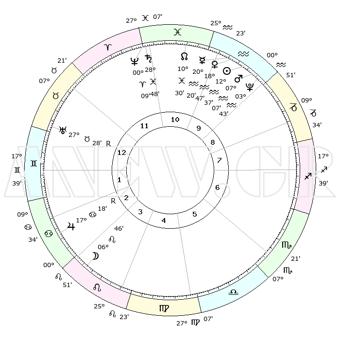 | | ΘΕΣΕΙΣ ΠΛΑΝΗΤΩΝ ΑΣΤΡΟΛΟΓΙΚΟΥ ΧΑΡΤΗ ΤΗΣ ΣΤΙΓΜΗΣ ΑΥΤΗΣ | | | | Πλανήτης | Ζώδιο | Μοίρες | Δεκαήμ. | Σε οίκο | Απόκλιση | | Ακμές των οίκων | | Ηλιος | Υδροχόος | 12°33' | Δεύτερο | 10 | 17 S 02 | | 1ος | 19°23' | Ταύρος | | Σελήνη | Λέων | 05°47' | Πρώτο | 4 | 21 N 36 | | 2ος | 16°33' | Δίδυμοι | | Ερμής | Υδροχόος | 20°13' | Τρίτο | 10 | 16 S 30 | | 3ος | 08°29' | Καρκίνος | | Αφροδίτη | Υδροχόος | 18°42' | Δεύτερο | 10 | 16 S 31 | | 4ος | 00°38' | Λέων | | Αρης | Υδροχόος | 07°03' | Πρώτο | 10 | 19 S 31 | | 5ος | 27°24' | Λέων | | Δίας | Καρκίνος | 17°19'R | Δεύτερο | 3 | 22 N 37 | | 6ος | 03°58' | Ζυγός | | Κρόνος | Ιχθείς | 28°48' | Τρίτο | 11 | 02 S 28 | | 7ος | 19°23' | Σκορπιός | | Ουρανός | Ταύρος | 27°28'R | Τρίτο | 1 | 19 N 24 | | 8ος | 16°33' | Τοξότης | | Ποσειδώνας | Κριός | 00°09' | Πρώτο | 11 | 01 S 09 | | 9ος | 08°29' | Αιγόκερως | | Πλούτωνας | Υδροχόος | 03°43' | Πρώτο | 10 | 23 S 01 | | 10ος | 00°38' | Υδροχόος | | Β. Δεσμός | Ιχθείς | 10°30' | Δεύτερο | 11 | 07 S 38 | | 11ος | 27°24' | Υδροχόος | | Ωροσκόπος | Ταύρος | 19°23' | Δεύτερο | | | 12ος | 03°58' | Κριός | | Μεσουράνημα | Υδροχόος | 00°38' | Πρώτο | | | |