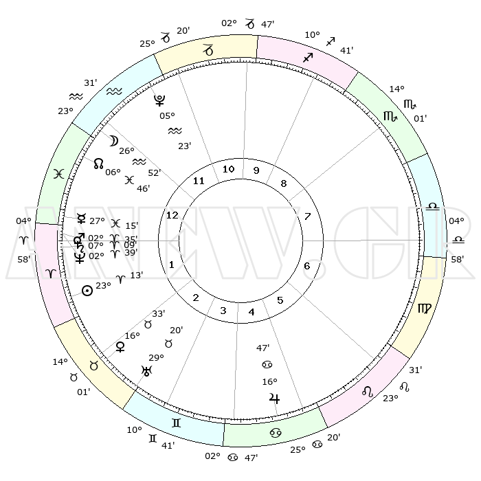 | | ΘΕΣΕΙΣ ΠΛΑΝΗΤΩΝ ΑΣΤΡΟΛΟΓΙΚΟΥ ΧΑΡΤΗ ΤΗΣ ΣΤΙΓΜΗΣ ΑΥΤΗΣ | | | | Πλανήτης | Ζώδιο | Μοίρες | Δεκαήμ. | Σε οίκο | Απόκλιση | | Ακμές των οίκων | | Ηλιος | Κριός | 23°09' | Τρίτο | 2 | 09 N 00 | | 1ος | 25°04' | Υδροχόος | | Σελήνη | Υδροχόος | 25°58' | Τρίτο | 1 | 13 S 53 | | 2ος | 10°47' | Κριός | | Ερμής | Ιχθείς | 27°09' | Τρίτο | 1 | 03 S 27 | | 3ος | 14°29' | Ταύρος | | Αφροδίτη | Ταύρος | 16°28' | Δεύτερο | 3 | 16 N 50 | | 4ος | 09°24' | Δίδυμοι | | Αρης | Κριός | 02°32' | Πρώτο | 1 | 00 N 06 | | 5ος | 01°08' | Καρκίνος | | Δίας | Καρκίνος | 16°46' | Δεύτερο | 5 | 22 N 45 | | 6ος | 24°12' | Καρκίνος | | Κρόνος | Κριός | 07°09' | Πρώτο | 1 | 00 N 52 | | 7ος | 25°04' | Λέων | | Ουρανός | Ταύρος | 29°20' | Τρίτο | 3 | 19 N 50 | | 8ος | 10°47' | Ζυγός | | Ποσειδώνας | Κριός | 02°39' | Πρώτο | 1 | 00 S 09 | | 9ος | 14°29' | Σκορπιός | | Πλούτωνας | Υδροχόος | 05°23' | Πρώτο | 12 | 22 S 47 | | 10ος | 09°24' | Τοξότης | | Β. Δεσμός | Ιχθείς | 06°46' | Πρώτο | 1 | 09 S 02 | | 11ος | 01°08' | Αιγόκερως | | Ωροσκόπος | Υδροχόος | 25°04' | Τρίτο | | | 12ος | 24°12' | Αιγόκερως | | Μεσουράνημα | Τοξότης | 09°24' | Πρώτο | | | |