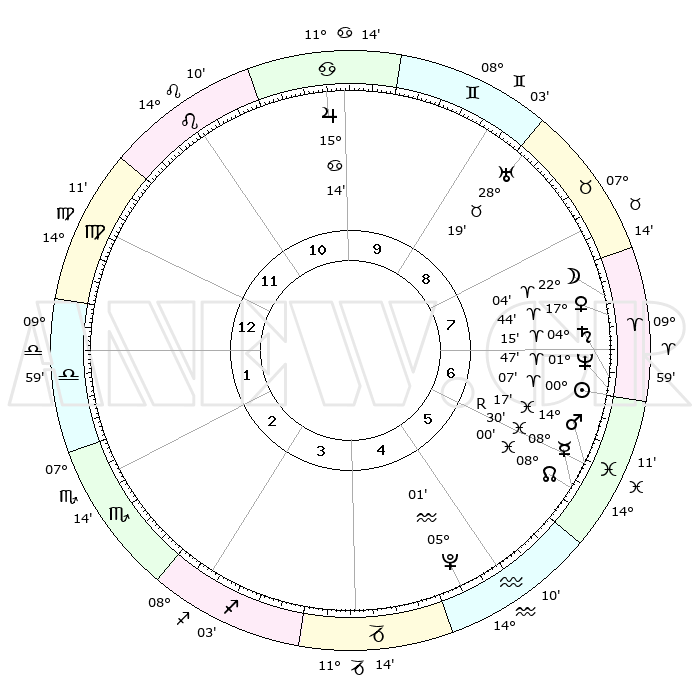 | | ΘΕΣΕΙΣ ΠΛΑΝΗΤΩΝ ΑΣΤΡΟΛΟΓΙΚΟΥ ΧΑΡΤΗ ΤΗΣ ΣΤΙΓΜΗΣ ΑΥΤΗΣ | | | | Πλανήτης | Ζώδιο | Μοίρες | Δεκαήμ. | Σε οίκο | Απόκλιση | | Ακμές των οίκων | | Ηλιος | Κριός | 00°02' | Πρώτο | 7 | 00 N 01 | | 1ος | 16°02' | Παρθένος | | Σελήνη | Κριός | 20°54' | Τρίτο | 8 | 11 N 25 | | 2ος | 11°28' | Ζυγός | | Ερμής | Ιχθείς | 08°30'R | Πρώτο | 6 | 07 S 26 | | 3ος | 11°17' | Σκορπιός | | Αφροδίτη | Κριός | 17°38' | Δεύτερο | 8 | 06 N 07 | | 4ος | 14°13' | Τοξότης | | Αρης | Ιχθείς | 14°13' | Δεύτερο | 6 | 07 S 12 | | 5ος | 17°33' | Αιγόκερως | | Δίας | Καρκίνος | 15°14' | Δεύτερο | 10 | 22 N 55 | | 6ος | 18°32' | Υδροχόος | | Κρόνος | Κριός | 04°15' | Πρώτο | 7 | 00 S 16 | | 7ος | 16°02' | Ιχθείς | | Ουρανός | Ταύρος | 28°18' | Τρίτο | 9 | 19 N 36 | | 8ος | 11°29' | Κριός | | Ποσειδώνας | Κριός | 01°47' | Πρώτο | 7 | 00 S 29 | | 9ος | 11°17' | Ταύρος | | Πλούτωνας | Υδροχόος | 05°00' | Πρώτο | 5 | 22 S 49 | | 10ος | 14°13' | Δίδυμοι | | Β. Δεσμός | Ιχθείς | 08°00' | Πρώτο | 6 | 08 S 34 | | 11ος | 17°33' | Καρκίνος | | Ωροσκόπος | Παρθένος | 16°02' | Δεύτερο | | | 12ος | 18°32' | Λέων | | Μεσουράνημα | Δίδυμοι | 14°13' | Δεύτερο | | | |