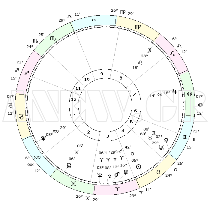 | | ΘΕΣΕΙΣ ΠΛΑΝΗΤΩΝ ΑΣΤΡΟΛΟΓΙΚΟΥ ΧΑΡΤΗ ΤΗΣ ΣΤΙΓΜΗΣ ΑΥΤΗΣ | | | | Πλανήτης | Ζώδιο | Μοίρες | Δεκαήμ. | Σε οίκο | Απόκλιση | | Ακμές των οίκων | | Ηλιος | Ταύρος | 05°39' | Πρώτο | 5 | 13 N 24 | | 1ος | 17°04' | Τοξότης | | Σελήνη | Λέων | 27°29' | Τρίτο | 8 | 13 N 10 | | 2ος | 21°11' | Αιγόκερως | | Ερμής | Κριός | 16°46' | Δεύτερο | 4 | 04 N 23 | | 3ος | 29°42' | Υδροχόος | | Αφροδίτη | Δίδυμοι | 02°03' | Πρώτο | 6 | 21 N 13 | | 4ος | 05°16' | Κριός | | Αρης | Κριός | 12°26' | Δεύτερο | 4 | 04 N 04 | | 5ος | 03°43' | Ταύρος | | Δίας | Καρκίνος | 18°14' | Δεύτερο | 7 | 22 N 35 | | 6ος | 26°39' | Ταύρος | | Κρόνος | Κριός | 08°40' | Πρώτο | 4 | 01 N 27 | | 7ος | 17°04' | Δίδυμοι | | Ουρανός | Ταύρος | 29°60' | Τρίτο | 6 | 19 N 59 | | 8ος | 21°11' | Καρκίνος | | Ποσειδώνας | Κριός | 03°06' | Πρώτο | 3 | 00 N 01 | | 9ος | 29°42' | Λέων | | Πλούτωνας | Υδροχόος | 05°29' | Πρώτο | 2 | 22 S 48 | | 10ος | 05°16' | Ζυγός | | Β. Δεσμός | Ιχθείς | 06°05' | Πρώτο | 3 | 09 S 17 | | 11ος | 03°43' | Σκορπιός | | Ωροσκόπος | Τοξότης | 17°04' | Δεύτερο | | | 12ος | 26°39' | Σκορπιός | | Μεσουράνημα | Ζυγός | 05°16' | Πρώτο | | | |
