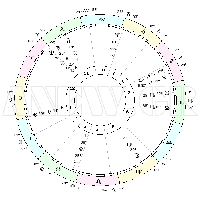 | | ΘΕΣΕΙΣ ΠΛΑΝΗΤΩΝ ΑΣΤΡΟΛΟΓΙΚΟΥ ΧΑΡΤΗ ΤΗΣ ΣΤΙΓΜΗΣ ΑΥΤΗΣ | | | | Πλανήτης | Ζώδιο | Μοίρες | Δεκαήμ. | Σε οίκο | Απόκλιση | | Ακμές των οίκων | | Ηλιος | Σκορπιός | 22°25' | Τρίτο | 8 | 18 S 22 | | 1ος | 08°44' | Κριός | | Σελήνη | Παρθένος | 19°31' | Δεύτερο | 6 | 03 N 53 | | 2ος | 16°48' | Ταύρος | | Ερμής | Τοξότης | 05°03'R | Πρώτο | 8 | 22 S 28 | | 3ος | 12°56' | Δίδυμοι | | Αφροδίτη | Σκορπιός | 09°33' | Πρώτο | 7 | 13 S 31 | | 4ος | 04°55' | Καρκίνος | | Αρης | Τοξότης | 07°14' | Πρώτο | 8 | 22 S 01 | | 5ος | 27°40' | Καρκίνος | | Δίας | Καρκίνος | 25°08'R | Τρίτο | 4 | 21 N 13 | | 6ος | 26°28' | Λέων | | Κρόνος | Ιχθείς | 25°27'R | Τρίτο | 12 | 04 S 02 | | 7ος | 08°44' | Ζυγός | | Ουρανός | Ταύρος | 29°44'R | Τρίτο | 2 | 19 N 53 | | 8ος | 16°48' | Σκορπιός | | Ποσειδώνας | Ιχθείς | 29°33'R | Τρίτο | 12 | 01 S 26 | | 9ος | 12°56' | Τοξότης | | Πλούτωνας | Υδροχόος | 01°36' | Πρώτο | 11 | 23 S 28 | | 10ος | 04°55' | Αιγόκερως | | Β. Δεσμός | Ιχθείς | 14°41' | Δεύτερο | 12 | 06 S 02 | | 11ος | 27°40' | Αιγόκερως | | Ωροσκόπος | Κριός | 08°44' | Πρώτο | | | 12ος | 26°28' | Υδροχόος | | Μεσουράνημα | Αιγόκερως | 04°55' | Πρώτο | | | |