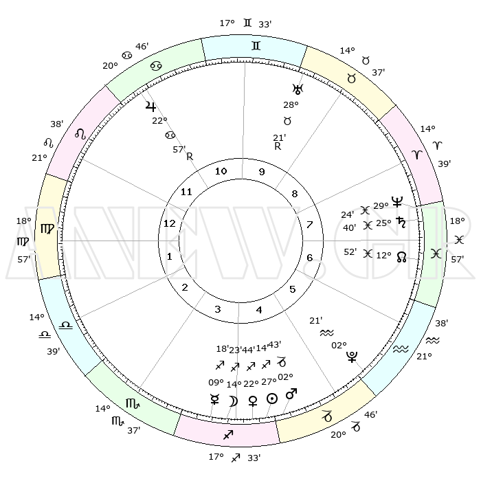 | | ΘΕΣΕΙΣ ΠΛΑΝΗΤΩΝ ΑΣΤΡΟΛΟΓΙΚΟΥ ΧΑΡΤΗ ΤΗΣ ΣΤΙΓΜΗΣ ΑΥΤΗΣ | | | | Πλανήτης | Ζώδιο | Μοίρες | Δεκαήμ. | Σε οίκο | Απόκλιση | | Ακμές των οίκων | | Ηλιος | Τοξότης | 26°48' | Τρίτο | 9 | 23 S 24 | | 1ος | 20°37' | Κριός | | Σελήνη | Τοξότης | 09°19' | Πρώτο | 8 | 26 S 46 | | 2ος | 25°27' | Ταύρος | | Ερμής | Τοξότης | 08°42' | Πρώτο | 8 | 20 S 40 | | 3ος | 20°03' | Δίδυμοι | | Αφροδίτη | Τοξότης | 22°12' | Τρίτο | 9 | 23 S 11 | | 4ος | 11°46' | Καρκίνος | | Αρης | Αιγόκερως | 02°24' | Πρώτο | 9 | 24 S 13 | | 5ος | 05°20' | Λέων | | Δίας | Καρκίνος | 22°60'R | Τρίτο | 4 | 21 N 41 | | 6ος | 06°15' | Παρθένος | | Κρόνος | Ιχθείς | 25°39' | Τρίτο | 12 | 03 S 51 | | 7ος | 20°37' | Ζυγός | | Ουρανός | Ταύρος | 28°22'R | Τρίτο | 2 | 19 N 36 | | 8ος | 25°27' | Σκορπιός | | Ποσειδώνας | Ιχθείς | 29°23' | Τρίτο | 12 | 01 S 28 | | 9ος | 20°03' | Τοξότης | | Πλούτωνας | Υδροχόος | 02°20' | Πρώτο | 10 | 23 S 18 | | 10ος | 11°46' | Αιγόκερως | | Β. Δεσμός | Ιχθείς | 12°53' | Δεύτερο | 12 | 06 S 43 | | 11ος | 05°20' | Υδροχόος | | Ωροσκόπος | Κριός | 20°37' | Τρίτο | | | 12ος | 06°15' | Ιχθείς | | Μεσουράνημα | Αιγόκερως | 11°46' | Δεύτερο | | | |