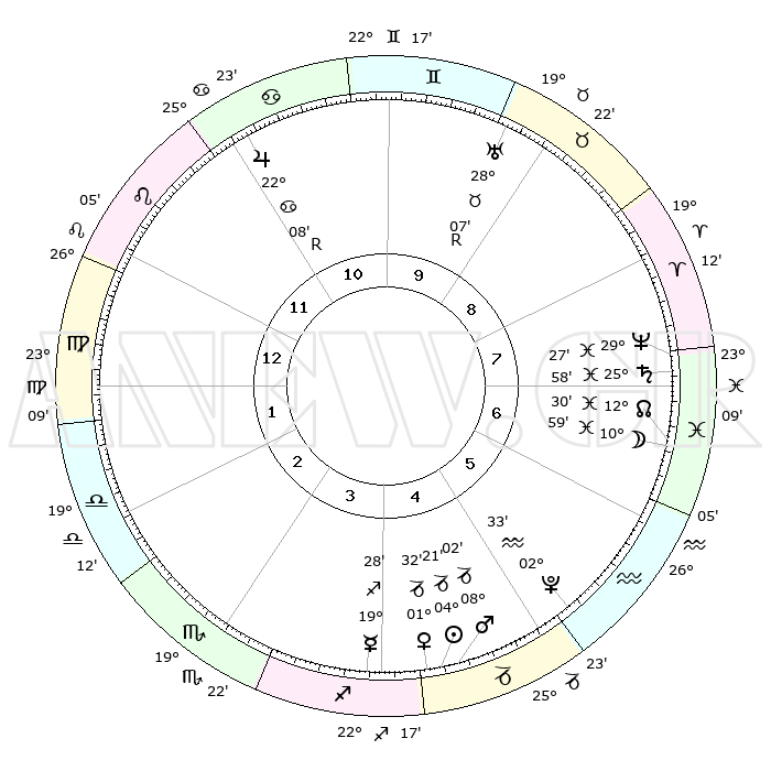| | ΘΕΣΕΙΣ ΠΛΑΝΗΤΩΝ ΑΣΤΡΟΛΟΓΙΚΟΥ ΧΑΡΤΗ ΤΗΣ ΣΤΙΓΜΗΣ ΑΥΤΗΣ | | | | Πλανήτης | Ζώδιο | Μοίρες | Δεκαήμ. | Σε οίκο | Απόκλιση | | Ακμές των οίκων | | Ηλιος | Αιγόκερως | 04°16' | Πρώτο | 5 | 23 S 22 | | 1ος | 29°32' | Λέων | | Σελήνη | Ιχθείς | 09°56' | Πρώτο | 7 | 07 S 57 | | 2ος | 23°20' | Παρθένος | | Ερμής | Τοξότης | 19°21' | Δεύτερο | 4 | 22 S 51 | | 3ος | 21°58' | Ζυγός | | Αφροδίτη | Αιγόκερως | 01°26' | Πρώτο | 5 | 23 S 42 | | 4ος | 24°53' | Σκορπιός | | Αρης | Αιγόκερως | 07°58' | Πρώτο | 5 | 24 S 03 | | 5ος | 29°06' | Τοξότης | | Δίας | Καρκίνος | 22°08'R | Τρίτο | 11 | 21 N 50 | | 6ος | 01°06' | Υδροχόος | | Κρόνος | Ιχθείς | 25°57' | Τρίτο | 8 | 03 S 42 | | 7ος | 29°32' | Υδροχόος | | Ουρανός | Ταύρος | 28°08'R | Τρίτο | 10 | 19 N 33 | | 8ος | 23°20' | Ιχθείς | | Ποσειδώνας | Ιχθείς | 29°27' | Τρίτο | 8 | 01 S 27 | | 9ος | 21°58' | Κριός | | Πλούτωνας | Υδροχόος | 02°32' | Πρώτο | 6 | 23 S 15 | | 10ος | 24°53' | Ταύρος | | Β. Δεσμός | Ιχθείς | 12°30' | Δεύτερο | 7 | 06 S 52 | | 11ος | 29°06' | Δίδυμοι | | Ωροσκόπος | Λέων | 29°32' | Τρίτο | | | 12ος | 01°06' | Λέων | | Μεσουράνημα | Ταύρος | 24°53' | Τρίτο | | | |