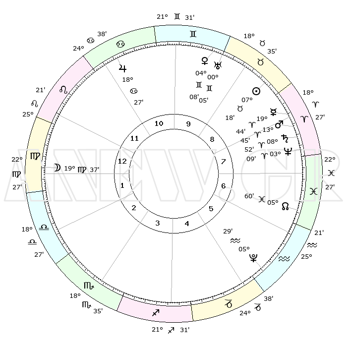 | | ΘΕΣΕΙΣ ΠΛΑΝΗΤΩΝ ΑΣΤΡΟΛΟΓΙΚΟΥ ΧΑΡΤΗ ΤΗΣ ΣΤΙΓΜΗΣ ΑΥΤΗΣ | | | | Πλανήτης | Ζώδιο | Μοίρες | Δεκαήμ. | Σε οίκο | Απόκλιση | | Ακμές των οίκων | | Ηλιος | Ταύρος | 07°14' | Πρώτο | 9 | 13 N 56 | | 1ος | 01°41' | Παρθένος | | Σελήνη | Παρθένος | 18°43' | Δεύτερο | 1 | 03 N 32 | | 2ος | 25°43' | Παρθένος | | Ερμής | Κριός | 19°37' | Δεύτερο | 8 | 05 N 35 | | 3ος | 24°32' | Ζυγός | | Αφροδίτη | Δίδυμοι | 04°03' | Πρώτο | 10 | 21 N 41 | | 4ος | 27°28' | Σκορπιός | | Αρης | Κριός | 13°41' | Δεύτερο | 8 | 04 N 34 | | 5ος | 01°33' | Αιγόκερως | | Δίας | Καρκίνος | 18°26' | Δεύτερο | 11 | 22 N 33 | | 6ος | 03°22' | Υδροχόος | | Κρόνος | Κριός | 08°52' | Πρώτο | 8 | 01 N 31 | | 7ος | 01°41' | Ιχθείς | | Ουρανός | Δίδυμοι | 00°05' | Πρώτο | 10 | 20 N 00 | | 8ος | 25°43' | Ιχθείς | | Ποσειδώνας | Κριός | 03°09' | Πρώτο | 8 | 00 N 03 | | 9ος | 24°32' | Κριός | | Πλούτωνας | Υδροχόος | 05°29' | Πρώτο | 6 | 22 S 48 | | 10ος | 27°28' | Ταύρος | | Β. Δεσμός | Ιχθείς | 06°00' | Πρώτο | 7 | 09 S 18 | | 11ος | 01°33' | Καρκίνος | | Ωροσκόπος | Παρθένος | 01°41' | Πρώτο | | | 12ος | 03°22' | Λέων | | Μεσουράνημα | Ταύρος | 27°28' | Τρίτο | | | |