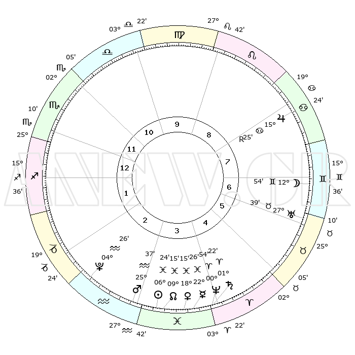 | | ΘΕΣΕΙΣ ΠΛΑΝΗΤΩΝ ΑΣΤΡΟΛΟΓΙΚΟΥ ΧΑΡΤΗ ΤΗΣ ΣΤΙΓΜΗΣ ΑΥΤΗΣ | | | | Πλανήτης | Ζώδιο | Μοίρες | Δεκαήμ. | Σε οίκο | Απόκλιση | | Ακμές των οίκων | | Ηλιος | Ιχθείς | 06°21' | Πρώτο | 3 | 09 S 11 | | 1ος | 27°38' | Σκορπιός | | Σελήνη | Δίδυμοι | 12°03' | Δεύτερο | 7 | 27 N 27 | | 2ος | 28°26' | Τοξότης | | Ερμής | Ιχθείς | 22°25' | Τρίτο | 4 | 00 S 43 | | 3ος | 03°45' | Υδροχόος | | Αφροδίτη | Ιχθείς | 18°11' | Δεύτερο | 4 | 05 S 58 | | 4ος | 09°44' | Ιχθείς | | Αρης | Υδροχόος | 25°34' | Τρίτο | 3 | 14 S 01 | | 5ος | 11°03' | Κριός | | Δίας | Καρκίνος | 15°25'R | Δεύτερο | 8 | 22 N 53 | | 6ος | 06°25' | Ταύρος | | Κρόνος | Κριός | 01°22' | Πρώτο | 4 | 01 S 25 | | 7ος | 27°38' | Ταύρος | | Ουρανός | Ταύρος | 27°39' | Τρίτο | 7 | 19 N 27 | | 8ος | 28°26' | Δίδυμοι | | Ποσειδώνας | Κριός | 00°54' | Πρώτο | 4 | 00 S 50 | | 9ος | 03°45' | Λέων | | Πλούτωνας | Υδροχόος | 04°26' | Πρώτο | 3 | 22 S 54 | | 10ος | 09°44' | Παρθένος | | Β. Δεσμός | Ιχθείς | 09°16' | Πρώτο | 3 | 08 S 06 | | 11ος | 11°03' | Ζυγός | | Ωροσκόπος | Σκορπιός | 27°38' | Τρίτο | | | 12ος | 06°25' | Σκορπιός | | Μεσουράνημα | Παρθένος | 09°44' | Πρώτο | | | |