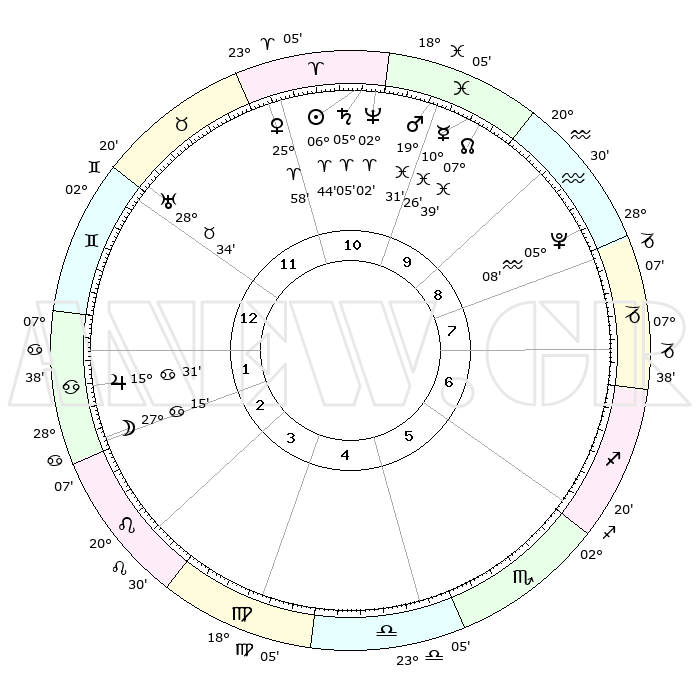 | | ΘΕΣΕΙΣ ΠΛΑΝΗΤΩΝ ΑΣΤΡΟΛΟΓΙΚΟΥ ΧΑΡΤΗ ΤΗΣ ΣΤΙΓΜΗΣ ΑΥΤΗΣ | | | | Πλανήτης | Ζώδιο | Μοίρες | Δεκαήμ. | Σε οίκο | Απόκλιση | | Ακμές των οίκων | | Ηλιος | Κριός | 06°39' | Πρώτο | 11 | 02 N 39 | | 1ος | 14°24' | Δίδυμοι | | Σελήνη | Καρκίνος | 26°18' | Τρίτο | 2 | 24 N 21 | | 2ος | 06°45' | Καρκίνος | | Ερμής | Ιχθείς | 10°24' | Δεύτερο | 10 | 08 S 06 | | 3ος | 27°58' | Καρκίνος | | Αφροδίτη | Κριός | 25°53' | Τρίτο | 11 | 09 N 25 | | 4ος | 22°06' | Λέων | | Αρης | Ιχθείς | 19°28' | Δεύτερο | 10 | 05 S 09 | | 5ος | 23°13' | Παρθένος | | Δίας | Καρκίνος | 15°30' | Δεύτερο | 2 | 22 N 54 | | 6ος | 03°18' | Σκορπιός | | Κρόνος | Κριός | 05°05' | Πρώτο | 11 | 00 N 04 | | 7ος | 14°24' | Τοξότης | | Ουρανός | Ταύρος | 28°34' | Τρίτο | 12 | 19 N 40 | | 8ος | 06°45' | Αιγόκερως | | Ποσειδώνας | Κριός | 02°02' | Πρώτο | 11 | 00 S 23 | | 9ος | 27°58' | Αιγόκερως | | Πλούτωνας | Υδροχόος | 05°08' | Πρώτο | 9 | 22 S 48 | | 10ος | 22°06' | Υδροχόος | | Β. Δεσμός | Ιχθείς | 07°39' | Πρώτο | 10 | 08 S 42 | | 11ος | 23°14' | Ιχθείς | | Ωροσκόπος | Δίδυμοι | 14°24' | Δεύτερο | | | 12ος | 03°18' | Ταύρος | | Μεσουράνημα | Υδροχόος | 22°06' | Τρίτο | | | |