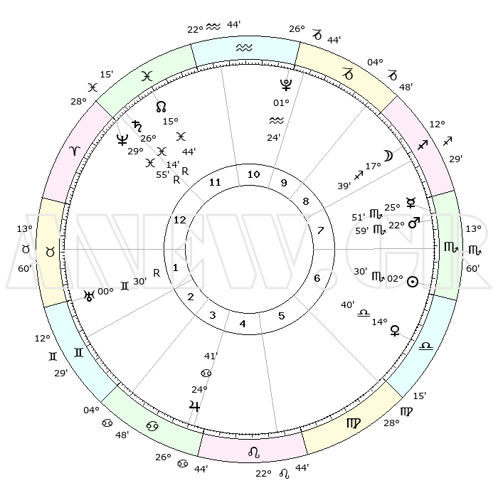| | ΘΕΣΕΙΣ ΠΛΑΝΗΤΩΝ ΑΣΤΡΟΛΟΓΙΚΟΥ ΧΑΡΤΗ ΤΗΣ ΣΤΙΓΜΗΣ ΑΥΤΗΣ | | | | Πλανήτης | Ζώδιο | Μοίρες | Δεκαήμ. | Σε οίκο | Απόκλιση | | Ακμές των οίκων | | Ηλιος | Σκορπιός | 02°05' | Πρώτο | 12 | 12 S 12 | | 1ος | 17°26' | Σκορπιός | | Σελήνη | Τοξότης | 12°42' | Δεύτερο | 1 | 27 S 23 | | 2ος | 17°07' | Τοξότης | | Ερμής | Σκορπιός | 25°22' | Τρίτο | 1 | 21 S 40 | | 3ος | 20°55' | Αιγόκερως | | Αφροδίτη | Ζυγός | 14°09' | Δεύτερο | 11 | 04 S 10 | | 4ος | 26°22' | Υδροχόος | | Αρης | Σκορπιός | 22°41' | Τρίτο | 1 | 18 S 45 | | 5ος | 28°37' | Ιχθείς | | Δίας | Καρκίνος | 24°40' | Τρίτο | 9 | 21 N 15 | | 6ος | 25°21' | Κριός | | Κρόνος | Ιχθείς | 26°16'R | Τρίτο | 4 | 03 S 46 | | 7ος | 17°26' | Ταύρος | | Ουρανός | Δίδυμοι | 00°31'R | Πρώτο | 7 | 20 N 03 | | 8ος | 17°07' | Δίδυμοι | | Ποσειδώνας | Ιχθείς | 29°56'R | Τρίτο | 5 | 01 S 17 | | 9ος | 20°55' | Καρκίνος | | Πλούτωνας | Υδροχόος | 01°24' | Πρώτο | 3 | 23 S 32 | | 10ος | 26°22' | Λέων | | Β. Δεσμός | Ιχθείς | 15°45' | Δεύτερο | 4 | 05 S 37 | | 11ος | 28°37' | Παρθένος | | Ωροσκόπος | Σκορπιός | 17°26' | Δεύτερο | | | 12ος | 25°21' | Ζυγός | | Μεσουράνημα | Λέων | 26°22' | Τρίτο | | | |