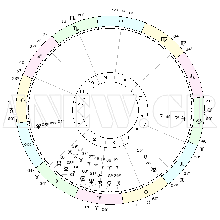 | | ΘΕΣΕΙΣ ΠΛΑΝΗΤΩΝ ΑΣΤΡΟΛΟΓΙΚΟΥ ΧΑΡΤΗ ΤΗΣ ΣΤΙΓΜΗΣ ΑΥΤΗΣ | | | | Πλανήτης | Ζώδιο | Μοίρες | Δεκαήμ. | Σε οίκο | Απόκλιση | | Ακμές των οίκων | | Ηλιος | Κριός | 00°23' | Πρώτο | 3 | 00 N 09 | | 1ος | 27°56' | Τοξότης | | Σελήνη | Κριός | 25°51' | Τρίτο | 4 | 13 N 33 | | 2ος | 04°34' | Υδροχόος | | Ερμής | Ιχθείς | 08°30' | Πρώτο | 2 | 07 S 30 | | 3ος | 14°25' | Ιχθείς | | Αφροδίτη | Κριός | 18°03' | Δεύτερο | 3 | 06 N 17 | | 4ος | 18°40' | Κριός | | Αρης | Ιχθείς | 14°29' | Δεύτερο | 3 | 07 S 06 | | 5ος | 15°19' | Ταύρος | | Δίας | Καρκίνος | 15°15' | Δεύτερο | 7 | 22 N 55 | | 6ος | 07°16' | Δίδυμοι | | Κρόνος | Κριός | 04°17' | Πρώτο | 3 | 00 S 15 | | 7ος | 27°56' | Δίδυμοι | | Ουρανός | Ταύρος | 28°19' | Τρίτο | 5 | 19 N 37 | | 8ος | 04°34' | Λέων | | Ποσειδώνας | Κριός | 01°48' | Πρώτο | 3 | 00 S 29 | | 9ος | 14°25' | Παρθένος | | Πλούτωνας | Υδροχόος | 05°01' | Πρώτο | 2 | 22 S 48 | | 10ος | 18°40' | Ζυγός | | Β. Δεσμός | Ιχθείς | 07°59' | Πρώτο | 2 | 08 S 34 | | 11ος | 15°19' | Σκορπιός | | Ωροσκόπος | Τοξότης | 27°56' | Τρίτο | | | 12ος | 07°16' | Τοξότης | | Μεσουράνημα | Ζυγός | 18°40' | Δεύτερο | | | |