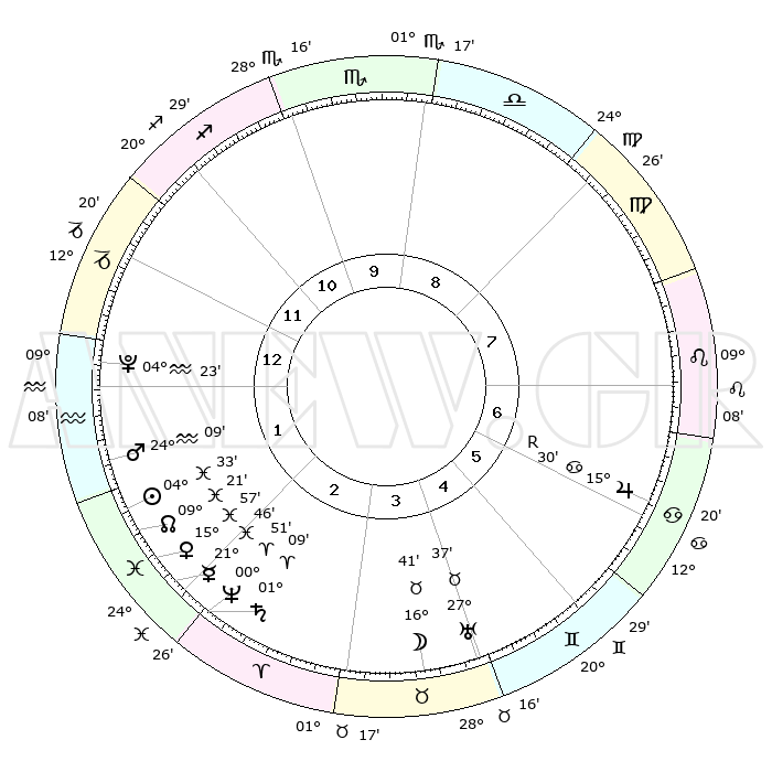 | | ΘΕΣΕΙΣ ΠΛΑΝΗΤΩΝ ΑΣΤΡΟΛΟΓΙΚΟΥ ΧΑΡΤΗ ΤΗΣ ΣΤΙΓΜΗΣ ΑΥΤΗΣ | | | | Πλανήτης | Ζώδιο | Μοίρες | Δεκαήμ. | Σε οίκο | Απόκλιση | | Ακμές των οίκων | | Ηλιος | Ιχθείς | 04°24' | Πρώτο | 3 | 09 S 54 | | 1ος | 14°34' | Τοξότης | | Σελήνη | Ταύρος | 14°34' | Δεύτερο | 5 | 20 N 48 | | 2ος | 18°10' | Αιγόκερως | | Ερμής | Ιχθείς | 21°42' | Τρίτο | 3 | 01 S 26 | | 3ος | 26°18' | Υδροχόος | | Αφροδίτη | Ιχθείς | 15°45' | Δεύτερο | 3 | 06 S 56 | | 4ος | 02°03' | Κριός | | Αρης | Υδροχόος | 24°02' | Τρίτο | 2 | 14 S 32 | | 5ος | 00°55' | Ταύρος | | Δίας | Καρκίνος | 15°30'R | Δεύτερο | 7 | 22 N 52 | | 6ος | 24°07' | Ταύρος | | Κρόνος | Κριός | 01°08' | Πρώτο | 3 | 01 S 31 | | 7ος | 14°34' | Δίδυμοι | | Ουρανός | Ταύρος | 27°37' | Τρίτο | 6 | 19 N 27 | | 8ος | 18°10' | Καρκίνος | | Ποσειδώνας | Κριός | 00°50' | Πρώτο | 3 | 00 S 52 | | 9ος | 26°18' | Λέων | | Πλούτωνας | Υδροχόος | 04°22' | Πρώτο | 2 | 22 S 54 | | 10ος | 02°03' | Ζυγός | | Β. Δεσμός | Ιχθείς | 09°22' | Πρώτο | 3 | 08 S 03 | | 11ος | 00°55' | Σκορπιός | | Ωροσκόπος | Τοξότης | 14°34' | Δεύτερο | | | 12ος | 24°07' | Σκορπιός | | Μεσουράνημα | Ζυγός | 02°03' | Πρώτο | | | |