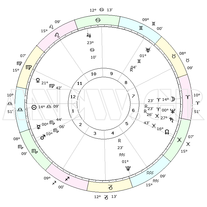 | ΘΕΣΕΙΣ ΠΛΑΝΗΤΩΝ ΑΣΤΡΟΛΟΓΙΚΟΥ ΧΑΡΤΗ ΤΗΣ ΣΤΙΓΜΗΣ ΑΥΤΗΣ | | Πλανήτης | Ζώδιο | Μοίρες | Δεκαήμ. | Σε οίκο | Απόκλιση | | Ακμές των οίκων | Ηλιος | Ζυγός | 14°04' | Δεύτερο | 2 | 05 S 33 | | 1ος | 12°49' | Παρθένος | Σελήνη | Κριός | 12°58' | Δεύτερο | 8 | 07 N 08 | | 2ος | 07°58' | Ζυγός | Ερμής | Σκορπιός | 00°36' | Πρώτο | 2 | 12 S 27 | | 3ος | 07°36' | Σκορπιός | Αφροδίτη | Παρθένος | 21°35' | Τρίτο | 1 | 04 N 38 | | 4ος | 10°32' | Τοξότης | Αρης | Σκορπιός | 10°02' | Δεύτερο | 3 | 14 S 57 | | 5ος | 13°60' | Αιγόκερως | Δίας | Καρκίνος | 23°10' | Τρίτο | 11 | 21 N 29 | | 6ος | 15°08' | Υδροχόος | Κρόνος | Ιχθείς | 27°26'R | Τρίτο | 7 | 03 S 19 | | 7ος | 12°49' | Ιχθείς | Ουρανός | Δίδυμοι | 01°04'R | Πρώτο | 9 | 20 N 10 | | 8ος | 07°58' | Κριός | Ποσειδώνας | Κριός | 00°23'R | Πρώτο | 7 | 01 S 07 | | 9ος | 07°36' | Ταύρος | Πλούτωνας | Υδροχόος | 01°23'R | Πρώτο | 5 | 23 S 32 | | 10ος | 10°32' | Δίδυμοι | Β. Δεσμός | Ιχθείς | 16°43' | Δεύτερο | 7 | 05 S 15 | | 11ος | 13°60' | Καρκίνος | Ωροσκόπος | Παρθένος | 12°49' | Δεύτερο | | | 12ος | 15°08' | Λέων | Μεσουράνημα | Δίδυμοι | 10°32' | Δεύτερο | | | |