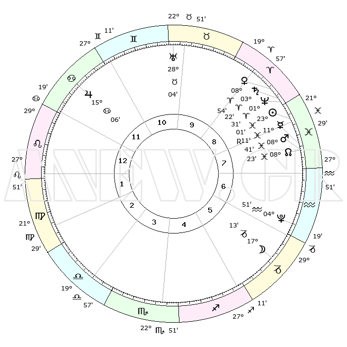 | | ΘΕΣΕΙΣ ΠΛΑΝΗΤΩΝ ΑΣΤΡΟΛΟΓΙΚΟΥ ΧΑΡΤΗ ΤΗΣ ΣΤΙΓΜΗΣ ΑΥΤΗΣ | | | | Πλανήτης | Ζώδιο | Μοίρες | Δεκαήμ. | Σε οίκο | Απόκλιση | | Ακμές των οίκων | | Ηλιος | Ιχθείς | 22°58' | Τρίτο | 8 | 02 S 47 | | 1ος | 12°34' | Λέων | | Σελήνη | Αιγόκερως | 16°35' | Δεύτερο | 6 | 26 S 33 | | 2ος | 04°38' | Παρθένος | | Ερμής | Ιχθείς | 11°13'R | Δεύτερο | 8 | 04 S 49 | | 3ος | 01°22' | Ζυγός | | Αφροδίτη | Κριός | 08°50' | Πρώτο | 9 | 02 N 30 | | 4ος | 03°38' | Σκορπιός | | Αρης | Ιχθείς | 08°38' | Πρώτο | 8 | 09 S 20 | | 5ος | 09°04' | Τοξότης | | Δίας | Καρκίνος | 15°06' | Δεύτερο | 12 | 22 N 56 | | 6ος | 12°52' | Αιγόκερως | | Κρόνος | Κριός | 03°22' | Πρώτο | 9 | 00 S 37 | | 7ος | 12°34' | Υδροχόος | | Ουρανός | Ταύρος | 28°04' | Τρίτο | 10 | 19 N 33 | | 8ος | 04°38' | Ιχθείς | | Ποσειδώνας | Κριός | 01°31' | Πρώτο | 9 | 00 S 36 | | 9ος | 01°22' | Κριός | | Πλούτωνας | Υδροχόος | 04°51' | Πρώτο | 6 | 22 S 50 | | 10ος | 03°38' | Ταύρος | | Β. Δεσμός | Ιχθείς | 08°23' | Πρώτο | 8 | 08 S 26 | | 11ος | 09°04' | Δίδυμοι | | Ωροσκόπος | Λέων | 12°34' | Δεύτερο | | | 12ος | 12°52' | Καρκίνος | | Μεσουράνημα | Ταύρος | 03°38' | Πρώτο | | | |