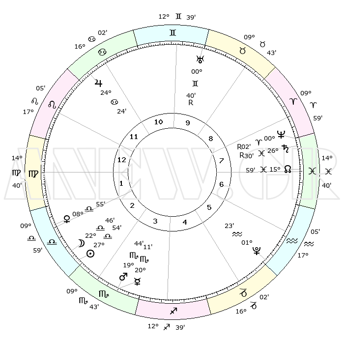 | ΘΕΣΕΙΣ ΠΛΑΝΗΤΩΝ ΑΣΤΡΟΛΟΓΙΚΟΥ ΧΑΡΤΗ ΤΗΣ ΣΤΙΓΜΗΣ ΑΥΤΗΣ | | Πλανήτης | Ζώδιο | Μοίρες | Δεκαήμ. | Σε οίκο | Απόκλιση | | Ακμές των οίκων | Ηλιος | Ζυγός | 27°46' | Τρίτο | 4 | 10 S 41 | | 1ος | 06°54' | Λέων | Σελήνη | Ζυγός | 21°12' | Τρίτο | 3 | 10 S 54 | | 2ος | 28°27' | Λέων | Ερμής | Σκορπιός | 20°01' | Τρίτο | 4 | 19 S 58 | | 3ος | 24°26' | Παρθένος | Αφροδίτη | Ζυγός | 08°45' | Πρώτο | 3 | 02 S 03 | | 4ος | 26°14' | Ζυγός | Αρης | Σκορπιός | 19°39' | Δεύτερο | 4 | 17 S 55 | | 5ος | 02°01' | Τοξότης | Δίας | Καρκίνος | 24°23' | Τρίτο | 12 | 21 N 18 | | 6ος | 06°37' | Αιγόκερως | Κρόνος | Ιχθείς | 26°31'R | Τρίτο | 9 | 03 S 40 | | 7ος | 06°54' | Υδροχόος | Ουρανός | Δίδυμοι | 00°40'R | Πρώτο | 10 | 20 N 05 | | 8ος | 28°27' | Υδροχόος | Ποσειδώνας | Κριός | 00°02'R | Πρώτο | 9 | 01 S 15 | | 9ος | 24°26' | Ιχθείς | Πλούτωνας | Υδροχόος | 01°23' | Πρώτο | 6 | 23 S 32 | | 10ος | 26°14' | Κριός | Β. Δεσμός | Ιχθείς | 15°59' | Δεύτερο | 8 | 05 S 32 | | 11ος | 02°01' | Δίδυμοι | Ωροσκόπος | Λέων | 06°54' | Πρώτο | | | 12ος | 06°37' | Καρκίνος | Μεσουράνημα | Κριός | 26°14' | Τρίτο | | | |