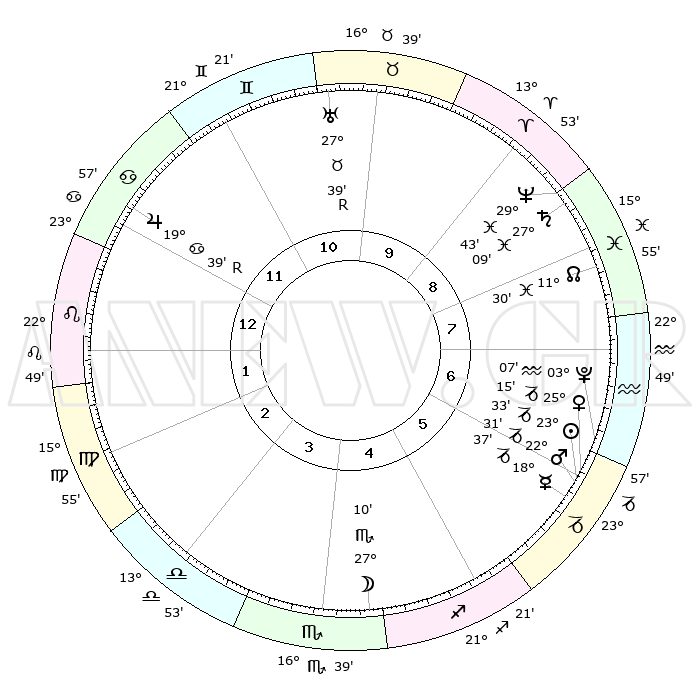 | | ΘΕΣΕΙΣ ΠΛΑΝΗΤΩΝ ΑΣΤΡΟΛΟΓΙΚΟΥ ΧΑΡΤΗ ΤΗΣ ΣΤΙΓΜΗΣ ΑΥΤΗΣ | | | | Πλανήτης | Ζώδιο | Μοίρες | Δεκαήμ. | Σε οίκο | Απόκλιση | | Ακμές των οίκων | | Ηλιος | Αιγόκερως | 23°29' | Τρίτο | 6 | 21 S 23 | | 1ος | 02°30' | Λέων | | Σελήνη | Σκορπιός | 26°20' | Τρίτο | 4 | 24 S 10 | | 2ος | 23°42' | Λέων | | Ερμής | Αιγόκερως | 18°30' | Δεύτερο | 6 | 23 S 51 | | 3ος | 19°05' | Παρθένος | | Αφροδίτη | Αιγόκερως | 25°10' | Τρίτο | 6 | 22 S 01 | | 4ος | 20°25' | Ζυγός | | Αρης | Αιγόκερως | 22°28' | Τρίτο | 6 | 22 S 31 | | 5ος | 26°24' | Σκορπιός | | Δίας | Καρκίνος | 19°39'R | Δεύτερο | 12 | 22 N 16 | | 6ος | 01°42' | Αιγόκερως | | Κρόνος | Ιχθείς | 27°09' | Τρίτο | 9 | 03 S 10 | | 7ος | 02°30' | Υδροχόος | | Ουρανός | Ταύρος | 27°39'R | Τρίτο | 11 | 19 N 27 | | 8ος | 23°42' | Υδροχόος | | Ποσειδώνας | Ιχθείς | 29°43' | Τρίτο | 9 | 01 S 20 | | 9ος | 19°05' | Ιχθείς | | Πλούτωνας | Υδροχόος | 03°07' | Πρώτο | 7 | 23 S 08 | | 10ος | 20°25' | Κριός | | Β. Δεσμός | Ιχθείς | 11°30' | Δεύτερο | 8 | 07 S 15 | | 11ος | 26°24' | Ταύρος | | Ωροσκόπος | Λέων | 02°30' | Πρώτο | | | 12ος | 01°42' | Καρκίνος | | Μεσουράνημα | Κριός | 20°25' | Τρίτο | | | |