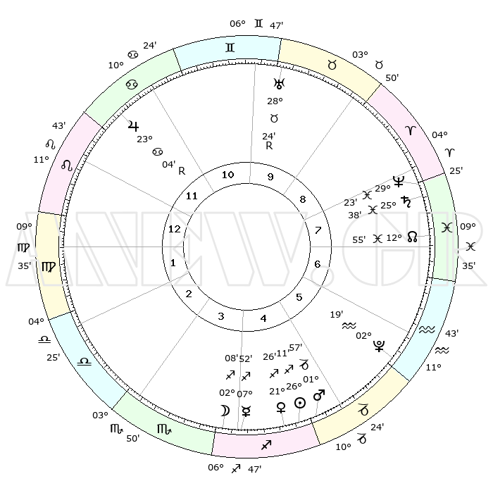 | | ΘΕΣΕΙΣ ΠΛΑΝΗΤΩΝ ΑΣΤΡΟΛΟΓΙΚΟΥ ΧΑΡΤΗ ΤΗΣ ΣΤΙΓΜΗΣ ΑΥΤΗΣ | | | | Πλανήτης | Ζώδιο | Μοίρες | Δεκαήμ. | Σε οίκο | Απόκλιση | | Ακμές των οίκων | | Ηλιος | Τοξότης | 26°06' | Τρίτο | 5 | 23 S 23 | | 1ος | 15°57' | Λέων | | Σελήνη | Τοξότης | 01°10' | Πρώτο | 4 | 25 S 11 | | 2ος | 08°21' | Παρθένος | | Ερμής | Τοξότης | 07°45' | Πρώτο | 4 | 20 S 26 | | 3ος | 05°30' | Ζυγός | | Αφροδίτη | Τοξότης | 21°20' | Τρίτο | 5 | 23 S 06 | | 4ος | 07°59' | Σκορπιός | | Αρης | Αιγόκερως | 01°53' | Πρώτο | 5 | 24 S 13 | | 5ος | 13°11' | Τοξότης | | Δίας | Καρκίνος | 23°04'R | Τρίτο | 12 | 21 N 40 | | 6ος | 16°33' | Αιγόκερως | | Κρόνος | Ιχθείς | 25°37' | Τρίτο | 8 | 03 S 51 | | 7ος | 15°57' | Υδροχόος | | Ουρανός | Ταύρος | 28°24'R | Τρίτο | 10 | 19 N 36 | | 8ος | 08°21' | Ιχθείς | | Ποσειδώνας | Ιχθείς | 29°23' | Τρίτο | 8 | 01 S 28 | | 9ος | 05°30' | Κριός | | Πλούτωνας | Υδροχόος | 02°19' | Πρώτο | 6 | 23 S 18 | | 10ος | 07°59' | Ταύρος | | Β. Δεσμός | Ιχθείς | 12°55' | Δεύτερο | 8 | 06 S 42 | | 11ος | 13°11' | Δίδυμοι | | Ωροσκόπος | Λέων | 15°57' | Δεύτερο | | | 12ος | 16°33' | Καρκίνος | | Μεσουράνημα | Ταύρος | 07°59' | Πρώτο | | | |