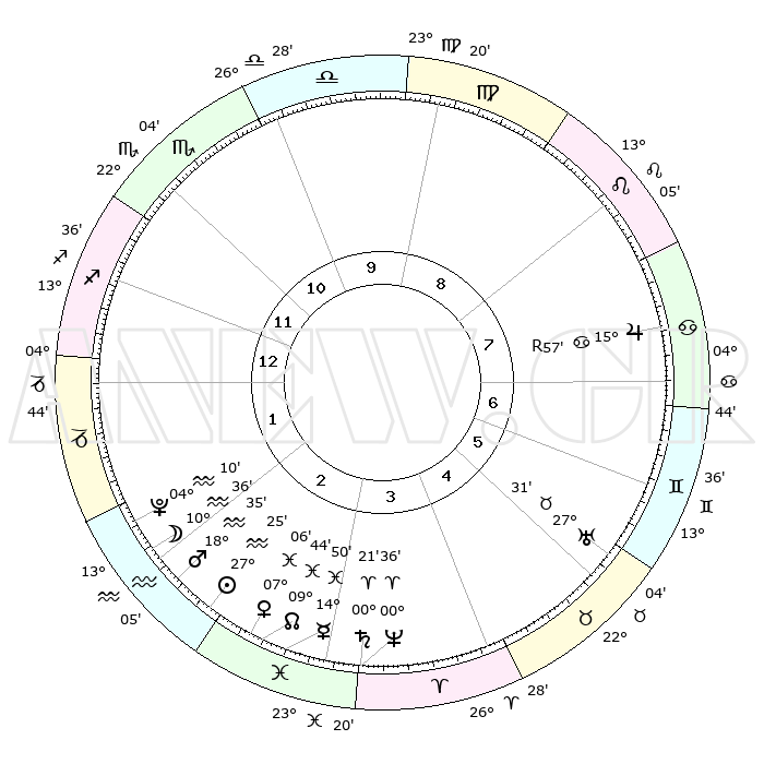 | | ΘΕΣΕΙΣ ΠΛΑΝΗΤΩΝ ΑΣΤΡΟΛΟΓΙΚΟΥ ΧΑΡΤΗ ΤΗΣ ΣΤΙΓΜΗΣ ΑΥΤΗΣ | | | | Πλανήτης | Ζώδιο | Μοίρες | Δεκαήμ. | Σε οίκο | Απόκλιση | | Ακμές των οίκων | | Ηλιος | Υδροχόος | 27°22' | Τρίτο | 2 | 12 S 23 | | 1ος | 17°26' | Τοξότης | | Σελήνη | Υδροχόος | 09°55' | Πρώτο | 2 | 20 S 14 | | 2ος | 21°37' | Αιγόκερως | | Ερμής | Ιχθείς | 14°45' | Δεύτερο | 3 | 05 S 44 | | 3ος | 00°12' | Ιχθείς | | Αφροδίτη | Ιχθείς | 07°02' | Πρώτο | 3 | 10 S 17 | | 4ος | 05°43' | Κριός | | Αρης | Υδροχόος | 18°33' | Δεύτερο | 2 | 16 S 18 | | 5ος | 04°08' | Ταύρος | | Δίας | Καρκίνος | 15°57'R | Δεύτερο | 7 | 22 N 48 | | 6ος | 27°01' | Ταύρος | | Κρόνος | Κριός | 00°20' | Πρώτο | 3 | 01 S 50 | | 7ος | 17°26' | Δίδυμοι | | Ουρανός | Ταύρος | 27°31' | Τρίτο | 6 | 19 N 25 | | 8ος | 21°37' | Καρκίνος | | Ποσειδώνας | Κριός | 00°36' | Πρώτο | 3 | 00 S 58 | | 9ος | 00°12' | Παρθένος | | Πλούτωνας | Υδροχόος | 04°10' | Πρώτο | 2 | 22 S 56 | | 10ος | 05°43' | Ζυγός | | Β. Δεσμός | Ιχθείς | 09°44' | Πρώτο | 3 | 07 S 55 | | 11ος | 04°08' | Σκορπιός | | Ωροσκόπος | Τοξότης | 17°26' | Δεύτερο | | | 12ος | 27°01' | Σκορπιός | | Μεσουράνημα | Ζυγός | 05°43' | Πρώτο | | | |