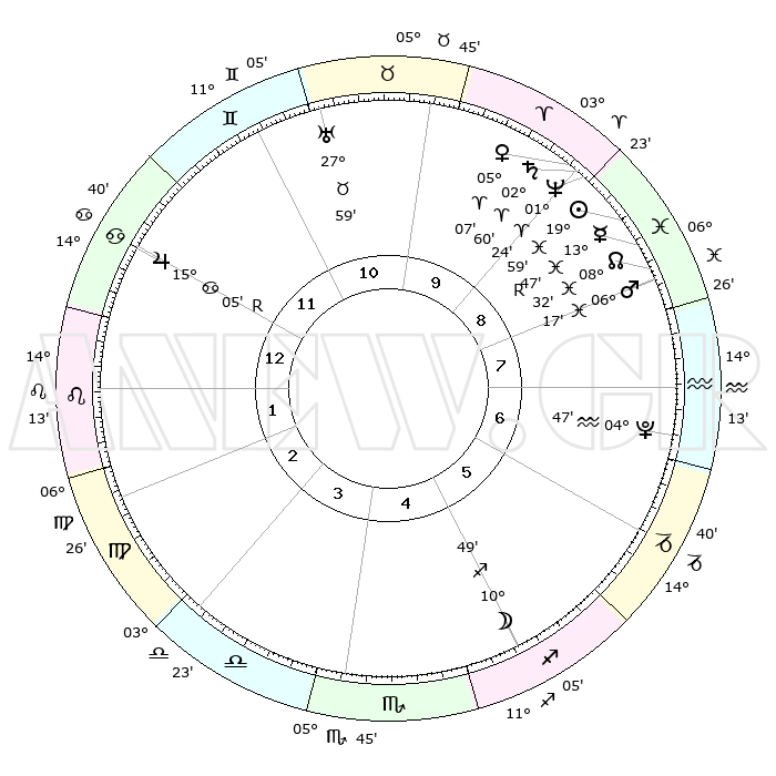 | | ΘΕΣΕΙΣ ΠΛΑΝΗΤΩΝ ΑΣΤΡΟΛΟΓΙΚΟΥ ΧΑΡΤΗ ΤΗΣ ΣΤΙΓΜΗΣ ΑΥΤΗΣ | | | | Πλανήτης | Ζώδιο | Μοίρες | Δεκαήμ. | Σε οίκο | Απόκλιση | | Ακμές των οίκων | | Ηλιος | Ιχθείς | 19°56' | Δεύτερο | 9 | 03 S 59 | | 1ος | 27°27' | Καρκίνος | | Σελήνη | Τοξότης | 10°08' | Δεύτερο | 5 | 27 S 11 | | 2ος | 18°20' | Λέων | | Ερμής | Ιχθείς | 13°50'R | Δεύτερο | 9 | 03 S 18 | | 3ος | 13°02' | Παρθένος | | Αφροδίτη | Κριός | 05°03' | Πρώτο | 9 | 00 N 56 | | 4ος | 13°44' | Ζυγός | | Αρης | Ιχθείς | 06°14' | Πρώτο | 8 | 10 S 14 | | 5ος | 19°49' | Σκορπιός | | Δίας | Καρκίνος | 15°05'R | Δεύτερο | 12 | 22 N 56 | | 6ος | 25°57' | Τοξότης | | Κρόνος | Κριός | 02°59' | Πρώτο | 9 | 00 S 46 | | 7ος | 27°27' | Αιγόκερως | | Ουρανός | Ταύρος | 27°58' | Τρίτο | 11 | 19 N 32 | | 8ος | 18°20' | Υδροχόος | | Ποσειδώνας | Κριός | 01°24' | Πρώτο | 9 | 00 S 39 | | 9ος | 13°02' | Ιχθείς | | Πλούτωνας | Υδροχόος | 04°47' | Πρώτο | 7 | 22 S 50 | | 10ος | 13°44' | Κριός | | Β. Δεσμός | Ιχθείς | 08°33' | Πρώτο | 8 | 08 S 22 | | 11ος | 19°49' | Ταύρος | | Ωροσκόπος | Καρκίνος | 27°27' | Τρίτο | | | 12ος | 25°57' | Δίδυμοι | | Μεσουράνημα | Κριός | 13°44' | Δεύτερο | | | |