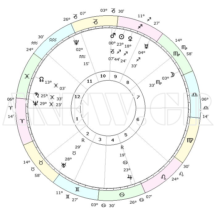 | | ΘΕΣΕΙΣ ΠΛΑΝΗΤΩΝ ΑΣΤΡΟΛΟΓΙΚΟΥ ΧΑΡΤΗ ΤΗΣ ΣΤΙΓΜΗΣ ΑΥΤΗΣ | | | | Πλανήτης | Ζώδιο | Μοίρες | Δεκαήμ. | Σε οίκο | Απόκλιση | | Ακμές των οίκων | | Ηλιος | Τοξότης | 23°39' | Τρίτο | 10 | 23 S 17 | | 1ος | 22°57' | Υδροχόος | | Σελήνη | Σκορπιός | 02°39' | Πρώτο | 8 | 15 S 59 | | 2ος | 08°44' | Κριός | | Ερμής | Τοξότης | 04°27' | Πρώτο | 9 | 19 S 34 | | 3ος | 12°51' | Ταύρος | | Αφροδίτη | Τοξότης | 18°18' | Δεύτερο | 10 | 22 S 46 | | 4ος | 08°01' | Δίδυμοι | | Αρης | Αιγόκερως | 00°04' | Πρώτο | 11 | 24 S 13 | | 5ος | 29°46' | Δίδυμοι | | Δίας | Καρκίνος | 23°20'R | Τρίτο | 6 | 21 N 37 | | 6ος | 22°39' | Καρκίνος | | Κρόνος | Ιχθείς | 25°33' | Τρίτο | 1 | 03 S 54 | | 7ος | 22°57' | Λέων | | Ουρανός | Ταύρος | 28°29'R | Τρίτο | 3 | 19 N 37 | | 8ος | 08°44' | Ζυγός | | Ποσειδώνας | Ιχθείς | 29°23' | Τρίτο | 1 | 01 S 29 | | 9ος | 12°51' | Σκορπιός | | Πλούτωνας | Υδροχόος | 02°15' | Πρώτο | 12 | 23 S 19 | | 10ος | 08°01' | Τοξότης | | Β. Δεσμός | Ιχθείς | 13°03' | Δεύτερο | 1 | 06 S 39 | | 11ος | 29°46' | Τοξότης | | Ωροσκόπος | Υδροχόος | 22°57' | Τρίτο | | | 12ος | 22°39' | Αιγόκερως | | Μεσουράνημα | Τοξότης | 08°01' | Πρώτο | | | |