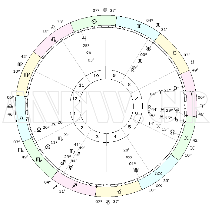 | | ΘΕΣΕΙΣ ΠΛΑΝΗΤΩΝ ΑΣΤΡΟΛΟΓΙΚΟΥ ΧΑΡΤΗ ΤΗΣ ΣΤΙΓΜΗΣ ΑΥΤΗΣ | | | | Πλανήτης | Ζώδιο | Μοίρες | Δεκαήμ. | Σε οίκο | Απόκλιση | | Ακμές των οίκων | | Ηλιος | Σκορπιός | 11°36' | Δεύτερο | 5 | 15 S 19 | | 1ος | 05°50' | Καρκίνος | | Σελήνη | Κριός | 16°28' | Δεύτερο | 10 | 08 N 48 | | 2ος | 26°21' | Καρκίνος | | Ερμής | Τοξότης | 04°37' | Πρώτο | 6 | 23 S 52 | | 3ος | 18°36' | Λέων | | Αφροδίτη | Ζυγός | 26°03' | Τρίτο | 5 | 08 S 43 | | 4ος | 15°52' | Παρθένος | | Αρης | Σκορπιός | 29°28' | Τρίτο | 5 | 20 S 26 | | 5ος | 20°39' | Ζυγός | | Δίας | Καρκίνος | 25°03' | Τρίτο | 1 | 21 N 12 | | 6ος | 00°07' | Τοξότης | | Κρόνος | Ιχθείς | 25°48'R | Τρίτο | 10 | 03 S 55 | | 7ος | 05°50' | Αιγόκερως | | Ουρανός | Δίδυμοι | 00°10'R | Πρώτο | 12 | 19 N 59 | | 8ος | 26°21' | Αιγόκερως | | Ποσειδώνας | Ιχθείς | 29°44'R | Τρίτο | 10 | 01 S 22 | | 9ος | 18°36' | Υδροχόος | | Πλούτωνας | Υδροχόος | 01°28' | Πρώτο | 8 | 23 S 30 | | 10ος | 15°52' | Ιχθείς | | Β. Δεσμός | Ιχθείς | 15°15' | Δεύτερο | 9 | 05 S 49 | | 11ος | 20°39' | Κριός | | Ωροσκόπος | Καρκίνος | 05°50' | Πρώτο | | | 12ος | 00°07' | Δίδυμοι | | Μεσουράνημα | Ιχθείς | 15°52' | Δεύτερο | | | |