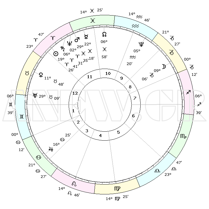 | | ΘΕΣΕΙΣ ΠΛΑΝΗΤΩΝ ΑΣΤΡΟΛΟΓΙΚΟΥ ΧΑΡΤΗ ΤΗΣ ΣΤΙΓΜΗΣ ΑΥΤΗΣ | | | | Πλανήτης | Ζώδιο | Μοίρες | Δεκαήμ. | Σε οίκο | Απόκλιση | | Ακμές των οίκων | | Ηλιος | Κριός | 19°21' | Δεύτερο | 12 | 07 N 34 | | 1ος | 01°49' | Ταύρος | | Σελήνη | Αιγόκερως | 08°12' | Πρώτο | 9 | 27 S 39 | | 2ος | 03°32' | Δίδυμοι | | Ερμής | Ιχθείς | 22°13' | Τρίτο | 12 | 05 S 11 | | 3ος | 26°55' | Δίδυμοι | | Αφροδίτη | Ταύρος | 11°43' | Δεύτερο | 1 | 15 N 15 | | 4ος | 18°37' | Καρκίνος | | Αρης | Ιχθείς | 29°31' | Τρίτο | 12 | 01 S 07 | | 5ος | 13°12' | Λέων | | Δίας | Καρκίνος | 16°25' | Δεύτερο | 3 | 22 N 48 | | 6ος | 16°16' | Παρθένος | | Κρόνος | Κριός | 06°41' | Πρώτο | 12 | 00 N 41 | | 7ος | 01°49' | Σκορπιός | | Ουρανός | Ταύρος | 29°08' | Τρίτο | 1 | 19 N 48 | | 8ος | 03°32' | Τοξότης | | Ποσειδώνας | Κριός | 02°31' | Πρώτο | 12 | 00 S 12 | | 9ος | 26°55' | Τοξότης | | Πλούτωνας | Υδροχόος | 05°20' | Πρώτο | 10 | 22 S 47 | | 10ος | 18°37' | Αιγόκερως | | Β. Δεσμός | Ιχθείς | 06°58' | Πρώτο | 11 | 08 S 57 | | 11ος | 13°12' | Υδροχόος | | Ωροσκόπος | Ταύρος | 01°49' | Πρώτο | | | 12ος | 16°16' | Ιχθείς | | Μεσουράνημα | Αιγόκερως | 18°37' | Δεύτερο | | | |
