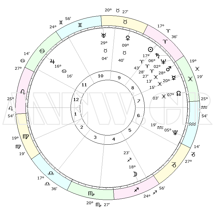 | | ΘΕΣΕΙΣ ΠΛΑΝΗΤΩΝ ΑΣΤΡΟΛΟΓΙΚΟΥ ΧΑΡΤΗ ΤΗΣ ΣΤΙΓΜΗΣ ΑΥΤΗΣ | | | | Πλανήτης | Ζώδιο | Μοίρες | Δεκαήμ. | Σε οίκο | Απόκλιση | | Ακμές των οίκων | | Ηλιος | Κριός | 17°39' | Δεύτερο | 9 | 06 N 55 | | 1ος | 05°59' | Λέων | | Σελήνη | Τοξότης | 17°34' | Δεύτερο | 5 | 27 S 56 | | 2ος | 27°28' | Λέων | | Ερμής | Ιχθείς | 20°10' | Τρίτο | 8 | 05 S 51 | | 3ος | 23°20' | Παρθένος | | Αφροδίτη | Ταύρος | 09°35' | Πρώτο | 10 | 14 N 31 | | 4ος | 25°02' | Ζυγός | | Αρης | Ιχθείς | 28°10' | Τρίτο | 9 | 01 S 40 | | 5ος | 00°51' | Τοξότης | | Δίας | Καρκίνος | 16°16' | Δεύτερο | 12 | 22 N 49 | | 6ος | 05°36' | Αιγόκερως | | Κρόνος | Κριός | 06°28' | Πρώτο | 9 | 00 N 36 | | 7ος | 05°59' | Υδροχόος | | Ουρανός | Ταύρος | 29°03' | Τρίτο | 10 | 19 N 47 | | 8ος | 27°28' | Υδροχόος | | Ποσειδώνας | Κριός | 02°27' | Πρώτο | 9 | 00 S 14 | | 9ος | 23°20' | Ιχθείς | | Πλούτωνας | Υδροχόος | 05°19' | Πρώτο | 6 | 22 S 47 | | 10ος | 25°02' | Κριός | | Β. Δεσμός | Ιχθείς | 07°04' | Πρώτο | 8 | 08 S 55 | | 11ος | 00°51' | Δίδυμοι | | Ωροσκόπος | Λέων | 05°59' | Πρώτο | | | 12ος | 05°36' | Καρκίνος | | Μεσουράνημα | Κριός | 25°02' | Τρίτο | | | |