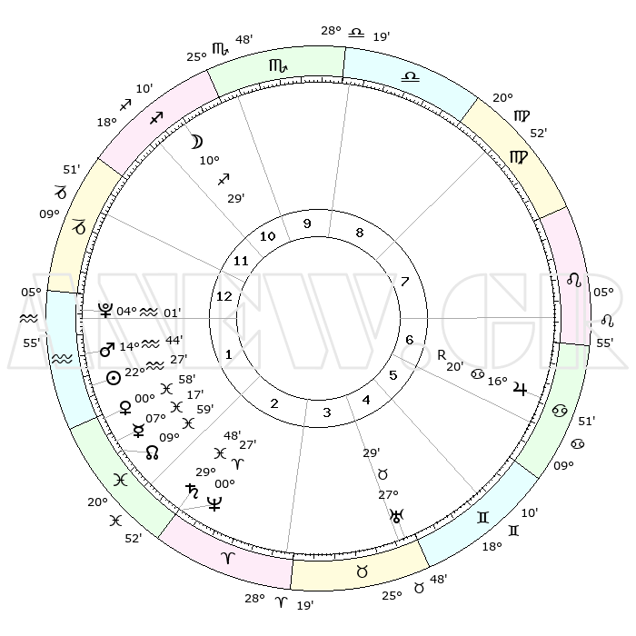 | | ΘΕΣΕΙΣ ΠΛΑΝΗΤΩΝ ΑΣΤΡΟΛΟΓΙΚΟΥ ΧΑΡΤΗ ΤΗΣ ΣΤΙΓΜΗΣ ΑΥΤΗΣ | | | | Πλανήτης | Ζώδιο | Μοίρες | Δεκαήμ. | Σε οίκο | Απόκλιση | | Ακμές των οίκων | | Ηλιος | Υδροχόος | 22°23' | Τρίτο | 2 | 14 S 03 | | 1ος | 08°55' | Αιγόκερως | | Σελήνη | Τοξότης | 09°41' | Πρώτο | 11 | 27 S 06 | | 2ος | 18°21' | Υδροχόος | | Ερμής | Ιχθείς | 07°11' | Πρώτο | 2 | 09 S 32 | | 3ος | 28°39' | Ιχθείς | | Αφροδίτη | Ιχθείς | 00°53' | Πρώτο | 2 | 12 S 31 | | 4ος | 01°02' | Ταύρος | | Αρης | Υδροχόος | 14°41' | Δεύτερο | 1 | 17 S 27 | | 5ος | 26°02' | Ταύρος | | Δίας | Καρκίνος | 16°21'R | Δεύτερο | 7 | 22 N 45 | | 6ος | 17°23' | Δίδυμοι | | Κρόνος | Ιχθείς | 29°48' | Τρίτο | 3 | 02 S 03 | | 7ος | 08°55' | Καρκίνος | | Ουρανός | Ταύρος | 27°29' | Τρίτο | 5 | 19 N 25 | | 8ος | 18°21' | Λέων | | Ποσειδώνας | Κριός | 00°27' | Πρώτο | 3 | 01 S 02 | | 9ος | 28°39' | Παρθένος | | Πλούτωνας | Υδροχόος | 04°01' | Πρώτο | 1 | 22 S 58 | | 10ος | 01°02' | Σκορπιός | | Β. Δεσμός | Ιχθείς | 09°60' | Πρώτο | 2 | 07 S 49 | | 11ος | 26°02' | Σκορπιός | | Ωροσκόπος | Αιγόκερως | 08°55' | Πρώτο | | | 12ος | 17°23' | Τοξότης | | Μεσουράνημα | Σκορπιός | 01°02' | Πρώτο | | | |