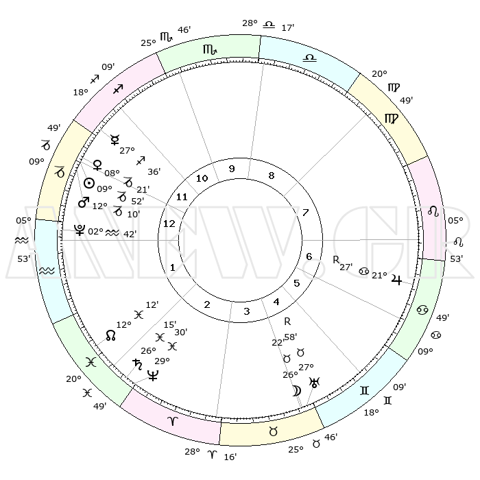 | | ΘΕΣΕΙΣ ΠΛΑΝΗΤΩΝ ΑΣΤΡΟΛΟΓΙΚΟΥ ΧΑΡΤΗ ΤΗΣ ΣΤΙΓΜΗΣ ΑΥΤΗΣ | | | | Πλανήτης | Ζώδιο | Μοίρες | Δεκαήμ. | Σε οίκο | Απόκλιση | | Ακμές των οίκων | | Ηλιος | Αιγόκερως | 09°47' | Πρώτο | 1 | 23 S 04 | | 1ος | 07°54' | Αιγόκερως | | Σελήνη | Ταύρος | 25°18' | Τρίτο | 5 | 23 N 49 | | 2ος | 17°05' | Υδροχόος | | Ερμής | Τοξότης | 27°30' | Τρίτο | 12 | 23 S 54 | | 3ος | 27°23' | Ιχθείς | | Αφροδίτη | Αιγόκερως | 08°15' | Πρώτο | 1 | 23 S 39 | | 4ος | 29°57' | Κριός | | Αρης | Αιγόκερως | 12°07' | Δεύτερο | 1 | 23 S 46 | | 5ος | 25°05' | Ταύρος | | Δίας | Καρκίνος | 21°27'R | Τρίτο | 7 | 21 N 57 | | 6ος | 16°29' | Δίδυμοι | | Κρόνος | Ιχθείς | 26°15' | Τρίτο | 2 | 03 S 34 | | 7ος | 07°54' | Καρκίνος | | Ουρανός | Ταύρος | 27°58'R | Τρίτο | 5 | 19 N 30 | | 8ος | 17°05' | Λέων | | Ποσειδώνας | Ιχθείς | 29°30' | Τρίτο | 3 | 01 S 25 | | 9ος | 27°23' | Παρθένος | | Πλούτωνας | Υδροχόος | 02°42' | Πρώτο | 1 | 23 S 13 | | 10ος | 29°57' | Ζυγός | | Β. Δεσμός | Ιχθείς | 12°13' | Δεύτερο | 2 | 06 S 59 | | 11ος | 25°05' | Σκορπιός | | Ωροσκόπος | Αιγόκερως | 07°54' | Πρώτο | | | 12ος | 16°29' | Τοξότης | | Μεσουράνημα | Ζυγός | 29°57' | Τρίτο | | | |