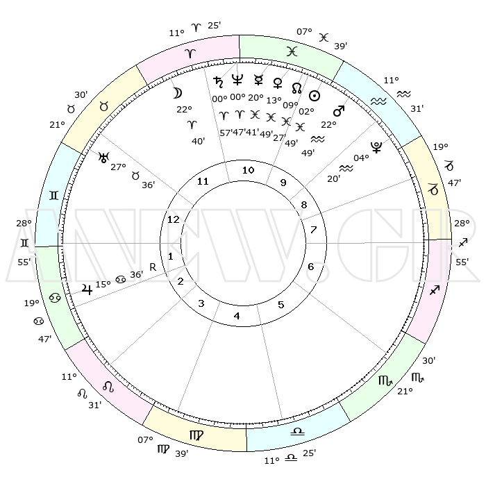 | | ΘΕΣΕΙΣ ΠΛΑΝΗΤΩΝ ΑΣΤΡΟΛΟΓΙΚΟΥ ΧΑΡΤΗ ΤΗΣ ΣΤΙΓΜΗΣ ΑΥΤΗΣ | | | | Πλανήτης | Ζώδιο | Μοίρες | Δεκαήμ. | Σε οίκο | Απόκλιση | | Ακμές των οίκων | | Ηλιος | Ιχθείς | 02°45' | Πρώτο | 10 | 10 S 30 | | 1ος | 28°55' | Ταύρος | | Σελήνη | Κριός | 21°33' | Τρίτο | 12 | 11 N 43 | | 2ος | 23°57' | Δίδυμοι | | Ερμής | Ιχθείς | 20°38' | Τρίτο | 11 | 02 S 14 | | 3ος | 15°25' | Καρκίνος | | Αφροδίτη | Ιχθείς | 13°43' | Δεύτερο | 11 | 07 S 44 | | 4ος | 08°06' | Λέων | | Αρης | Υδροχόος | 22°45' | Τρίτο | 10 | 14 S 57 | | 5ος | 06°22' | Παρθένος | | Δίας | Καρκίνος | 15°36'R | Δεύτερο | 3 | 22 N 51 | | 6ος | 14°39' | Ζυγός | | Κρόνος | Κριός | 00°57' | Πρώτο | 11 | 01 S 35 | | 7ος | 28°55' | Σκορπιός | | Ουρανός | Ταύρος | 27°35' | Τρίτο | 12 | 19 N 26 | | 8ος | 23°57' | Τοξότης | | Ποσειδώνας | Κριός | 00°47' | Πρώτο | 11 | 00 S 53 | | 9ος | 15°25' | Αιγόκερως | | Πλούτωνας | Υδροχόος | 04°19' | Πρώτο | 9 | 22 S 55 | | 10ος | 08°06' | Υδροχόος | | Β. Δεσμός | Ιχθείς | 09°27' | Πρώτο | 11 | 08 S 02 | | 11ος | 06°22' | Ιχθείς | | Ωροσκόπος | Ταύρος | 28°55' | Τρίτο | | | 12ος | 14°39' | Κριός | | Μεσουράνημα | Υδροχόος | 08°06' | Πρώτο | | | |