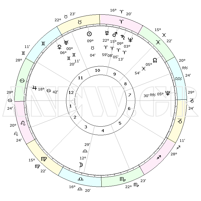 | | ΘΕΣΕΙΣ ΠΛΑΝΗΤΩΝ ΑΣΤΡΟΛΟΓΙΚΟΥ ΧΑΡΤΗ ΤΗΣ ΣΤΙΓΜΗΣ ΑΥΤΗΣ | | | | Πλανήτης | Ζώδιο | Μοίρες | Δεκαήμ. | Σε οίκο | Απόκλιση | | Ακμές των οίκων | | Ηλιος | Ταύρος | 09°02' | Πρώτο | 11 | 14 N 30 | | 1ος | 15°58' | Καρκίνος | | Σελήνη | Ζυγός | 11°55' | Δεύτερο | 4 | 07 S 22 | | 2ος | 06°25' | Λέων | | Ερμής | Κριός | 22°54' | Τρίτο | 10 | 06 N 57 | | 3ος | 29°40' | Λέων | | Αφροδίτη | Δίδυμοι | 06°16' | Πρώτο | 11 | 22 N 10 | | 4ος | 28°38' | Παρθένος | | Αρης | Κριός | 15°06' | Δεύτερο | 10 | 05 N 07 | | 5ος | 04°25' | Σκορπιός | | Δίας | Καρκίνος | 18°41' | Δεύτερο | 1 | 22 N 31 | | 6ος | 12°28' | Τοξότης | | Κρόνος | Κριός | 09°04' | Πρώτο | 10 | 01 N 36 | | 7ος | 15°58' | Αιγόκερως | | Ουρανός | Δίδυμοι | 00°11' | Πρώτο | 11 | 20 N 01 | | 8ος | 06°25' | Υδροχόος | | Ποσειδώνας | Κριός | 03°13' | Πρώτο | 10 | 00 N 04 | | 9ος | 29°40' | Υδροχόος | | Πλούτωνας | Υδροχόος | 05°30' | Πρώτο | 7 | 22 S 49 | | 10ος | 28°38' | Ιχθείς | | Β. Δεσμός | Ιχθείς | 05°54' | Πρώτο | 9 | 09 S 21 | | 11ος | 04°25' | Ταύρος | | Ωροσκόπος | Καρκίνος | 15°58' | Δεύτερο | | | 12ος | 12°28' | Δίδυμοι | | Μεσουράνημα | Ιχθείς | 28°38' | Τρίτο | | | |