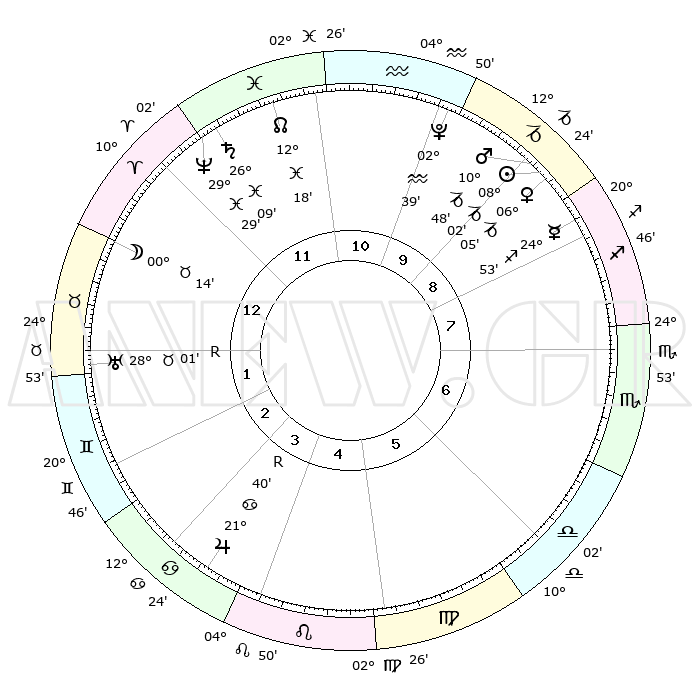 | | ΘΕΣΕΙΣ ΠΛΑΝΗΤΩΝ ΑΣΤΡΟΛΟΓΙΚΟΥ ΧΑΡΤΗ ΤΗΣ ΣΤΙΓΜΗΣ ΑΥΤΗΣ | | | | Πλανήτης | Ζώδιο | Μοίρες | Δεκαήμ. | Σε οίκο | Απόκλιση | | Ακμές των οίκων | | Ηλιος | Αιγόκερως | 07°58' | Πρώτο | 9 | 23 S 12 | | 1ος | 17°57' | Κριός | | Σελήνη | Κριός | 29°12' | Τρίτο | 1 | 14 N 43 | | 2ος | 23°31' | Ταύρος | | Ερμής | Τοξότης | 24°47' | Τρίτο | 9 | 23 S 37 | | 3ος | 18°27' | Δίδυμοι | | Αφροδίτη | Αιγόκερως | 05°60' | Πρώτο | 9 | 23 S 42 | | 4ος | 10°12' | Καρκίνος | | Αρης | Αιγόκερως | 10°44' | Δεύτερο | 10 | 23 S 52 | | 5ος | 03°34' | Λέων | | Δίας | Καρκίνος | 21°41'R | Τρίτο | 4 | 21 N 55 | | 6ος | 03°59' | Παρθένος | | Κρόνος | Ιχθείς | 26°09' | Τρίτο | 12 | 03 S 37 | | 7ος | 17°57' | Ζυγός | | Ουρανός | Ταύρος | 28°01'R | Τρίτο | 2 | 19 N 31 | | 8ος | 23°31' | Σκορπιός | | Ποσειδώνας | Ιχθείς | 29°29' | Τρίτο | 12 | 01 S 26 | | 9ος | 18°27' | Τοξότης | | Πλούτωνας | Υδροχόος | 02°39' | Πρώτο | 10 | 23 S 14 | | 10ος | 10°12' | Αιγόκερως | | Β. Δεσμός | Ιχθείς | 12°18' | Δεύτερο | 12 | 06 S 57 | | 11ος | 03°34' | Υδροχόος | | Ωροσκόπος | Κριός | 17°57' | Δεύτερο | | | 12ος | 03°59' | Ιχθείς | | Μεσουράνημα | Αιγόκερως | 10°12' | Δεύτερο | | | |
