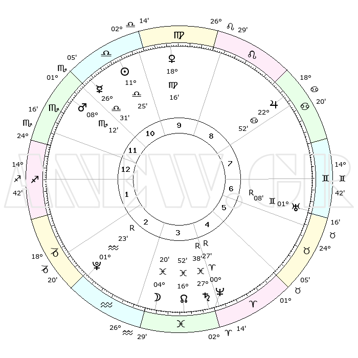 | ΘΕΣΕΙΣ ΠΛΑΝΗΤΩΝ ΑΣΤΡΟΛΟΓΙΚΟΥ ΧΑΡΤΗ ΤΗΣ ΣΤΙΓΜΗΣ ΑΥΤΗΣ | | Πλανήτης | Ζώδιο | Μοίρες | Δεκαήμ. | Σε οίκο | Απόκλιση | | Ακμές των οίκων | Ηλιος | Ζυγός | 11°19' | Δεύτερο | 11 | 04 S 28 | | 1ος | 10°53' | Σκορπιός | Σελήνη | Ιχθείς | 02°44' | Πρώτο | 4 | 11 S 48 | | 2ος | 10°01' | Τοξότης | Ερμής | Ζυγός | 26°20' | Τρίτο | 12 | 10 S 38 | | 3ος | 13°01' | Αιγόκερως | Αφροδίτη | Παρθένος | 18°08' | Δεύτερο | 10 | 05 N 57 | | 4ος | 17°60' | Υδροχόος | Αρης | Σκορπιός | 08°07' | Πρώτο | 12 | 14 S 19 | | 5ος | 20°38' | Ιχθείς | Δίας | Καρκίνος | 22°51' | Τρίτο | 9 | 21 N 31 | | 6ος | 18°10' | Κριός | Κρόνος | Ιχθείς | 27°39'R | Τρίτο | 5 | 03 S 15 | | 7ος | 10°53' | Ταύρος | Ουρανός | Δίδυμοι | 01°08'R | Πρώτο | 7 | 20 N 11 | | 8ος | 10°01' | Δίδυμοι | Ποσειδώνας | Κριός | 00°27'R | Πρώτο | 5 | 01 S 05 | | 9ος | 13°01' | Καρκίνος | Πλούτωνας | Υδροχόος | 01°23'R | Πρώτο | 3 | 23 S 32 | | 10ος | 17°60' | Λέων | Β. Δεσμός | Ιχθείς | 16°52' | Δεύτερο | 4 | 05 S 11 | | 11ος | 20°38' | Παρθένος | Ωροσκόπος | Σκορπιός | 10°53' | Δεύτερο | | | 12ος | 18°10' | Ζυγός | Μεσουράνημα | Λέων | 17°60' | Δεύτερο | | | |