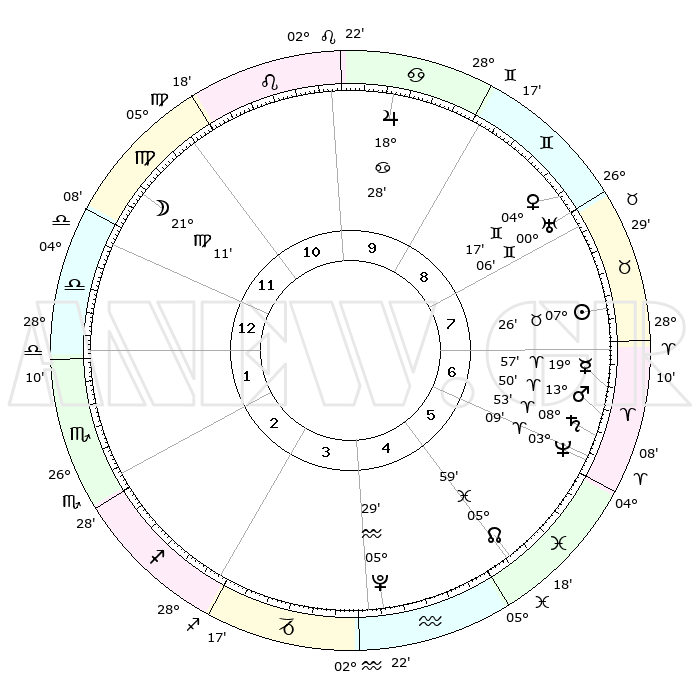 | | ΘΕΣΕΙΣ ΠΛΑΝΗΤΩΝ ΑΣΤΡΟΛΟΓΙΚΟΥ ΧΑΡΤΗ ΤΗΣ ΣΤΙΓΜΗΣ ΑΥΤΗΣ | | | | Πλανήτης | Ζώδιο | Μοίρες | Δεκαήμ. | Σε οίκο | Απόκλιση | | Ακμές των οίκων | | Ηλιος | Ταύρος | 07°22' | Πρώτο | 7 | 13 N 58 | | 1ος | 12°31' | Ζυγός | | Σελήνη | Παρθένος | 20°30' | Τρίτο | 12 | 02 N 42 | | 2ος | 09°55' | Σκορπιός | | Ερμής | Κριός | 19°52' | Δεύτερο | 7 | 05 N 41 | | 3ος | 10°51' | Τοξότης | | Αφροδίτη | Δίδυμοι | 04°13' | Πρώτο | 8 | 21 N 43 | | 4ος | 14°07' | Αιγόκερως | | Αρης | Κριός | 13°48' | Δεύτερο | 7 | 04 N 36 | | 5ος | 17°03' | Υδροχόος | | Δίας | Καρκίνος | 18°28' | Δεύτερο | 10 | 22 N 33 | | 6ος | 16°56' | Ιχθείς | | Κρόνος | Κριός | 08°53' | Πρώτο | 6 | 01 N 32 | | 7ος | 12°31' | Κριός | | Ουρανός | Δίδυμοι | 00°05' | Πρώτο | 8 | 20 N 00 | | 8ος | 09°55' | Ταύρος | | Ποσειδώνας | Κριός | 03°09' | Πρώτο | 6 | 00 N 03 | | 9ος | 10°51' | Δίδυμοι | | Πλούτωνας | Υδροχόος | 05°29' | Πρώτο | 4 | 22 S 48 | | 10ος | 14°07' | Καρκίνος | | Β. Δεσμός | Ιχθείς | 05°60' | Πρώτο | 5 | 09 S 19 | | 11ος | 17°03' | Λέων | | Ωροσκόπος | Ζυγός | 12°31' | Δεύτερο | | | 12ος | 16°56' | Παρθένος | | Μεσουράνημα | Καρκίνος | 14°07' | Δεύτερο | | | |