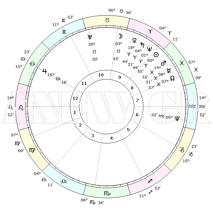 | | ΘΕΣΕΙΣ ΠΛΑΝΗΤΩΝ ΑΣΤΡΟΛΟΓΙΚΟΥ ΧΑΡΤΗ ΤΗΣ ΣΤΙΓΜΗΣ ΑΥΤΗΣ | | | | Πλανήτης | Ζώδιο | Μοίρες | Δεκαήμ. | Σε οίκο | Απόκλιση | | Ακμές των οίκων | | Ηλιος | Κριός | 00°51' | Πρώτο | 9 | 00 N 20 | | 1ος | 25°15' | Καρκίνος | | Σελήνη | Ταύρος | 02°45' | Πρώτο | 10 | 16 N 24 | | 2ος | 16°00' | Λέων | | Ερμής | Ιχθείς | 08°31' | Πρώτο | 8 | 07 S 36 | | 3ος | 10°25' | Παρθένος | | Αφροδίτη | Κριός | 18°39' | Δεύτερο | 10 | 06 N 32 | | 4ος | 10°49' | Ζυγός | | Αρης | Ιχθείς | 14°52' | Δεύτερο | 9 | 06 S 57 | | 5ος | 16°55' | Σκορπιός | | Δίας | Καρκίνος | 15°16' | Δεύτερο | 12 | 22 N 55 | | 6ος | 23°25' | Τοξότης | | Κρόνος | Κριός | 04°21' | Πρώτο | 9 | 00 S 13 | | 7ος | 25°15' | Αιγόκερως | | Ουρανός | Ταύρος | 28°20' | Τρίτο | 11 | 19 N 37 | | 8ος | 16°00' | Υδροχόος | | Ποσειδώνας | Κριός | 01°49' | Πρώτο | 9 | 00 S 29 | | 9ος | 10°25' | Ιχθείς | | Πλούτωνας | Υδροχόος | 05°01' | Πρώτο | 7 | 22 S 48 | | 10ος | 10°49' | Κριός | | Β. Δεσμός | Ιχθείς | 07°58' | Πρώτο | 8 | 08 S 35 | | 11ος | 16°55' | Ταύρος | | Ωροσκόπος | Καρκίνος | 25°15' | Τρίτο | | | 12ος | 23°25' | Δίδυμοι | | Μεσουράνημα | Κριός | 10°49' | Δεύτερο | | | |