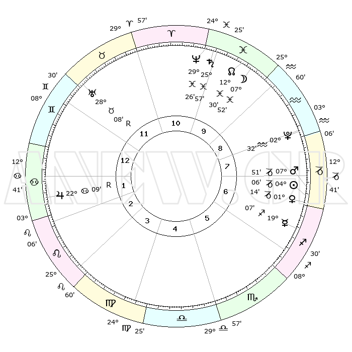 | | ΘΕΣΕΙΣ ΠΛΑΝΗΤΩΝ ΑΣΤΡΟΛΟΓΙΚΟΥ ΧΑΡΤΗ ΤΗΣ ΣΤΙΓΜΗΣ ΑΥΤΗΣ | | | | Πλανήτης | Ζώδιο | Μοίρες | Δεκαήμ. | Σε οίκο | Απόκλιση | | Ακμές των οίκων | | Ηλιος | Αιγόκερως | 04°02' | Πρώτο | 7 | 23 S 22 | | 1ος | 18°33' | Δίδυμοι | | Σελήνη | Ιχθείς | 06°55' | Πρώτο | 10 | 09 S 20 | | 2ος | 10°22' | Καρκίνος | | Ερμής | Τοξότης | 19°00' | Δεύτερο | 7 | 22 S 48 | | 3ος | 01°40' | Λέων | | Αφροδίτη | Αιγόκερως | 01°09' | Πρώτο | 7 | 23 S 41 | | 4ος | 26°19' | Λέων | | Αρης | Αιγόκερως | 07°48' | Πρώτο | 7 | 24 S 03 | | 5ος | 28°13' | Παρθένος | | Δίας | Καρκίνος | 22°10'R | Τρίτο | 2 | 21 N 50 | | 6ος | 08°29' | Σκορπιός | | Κρόνος | Ιχθείς | 25°57' | Τρίτο | 10 | 03 S 42 | | 7ος | 18°33' | Τοξότης | | Ουρανός | Ταύρος | 28°08'R | Τρίτο | 12 | 19 N 33 | | 8ος | 10°22' | Αιγόκερως | | Ποσειδώνας | Ιχθείς | 29°26' | Τρίτο | 11 | 01 S 27 | | 9ος | 01°40' | Υδροχόος | | Πλούτωνας | Υδροχόος | 02°32' | Πρώτο | 9 | 23 S 16 | | 10ος | 26°19' | Υδροχόος | | Β. Δεσμός | Ιχθείς | 12°31' | Δεύτερο | 10 | 06 S 52 | | 11ος | 28°13' | Ιχθείς | | Ωροσκόπος | Δίδυμοι | 18°33' | Δεύτερο | | | 12ος | 08°29' | Ταύρος | | Μεσουράνημα | Υδροχόος | 26°19' | Τρίτο | | | |