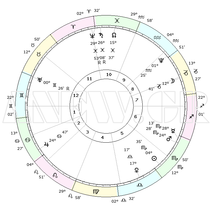 | | ΘΕΣΕΙΣ ΠΛΑΝΗΤΩΝ ΑΣΤΡΟΛΟΓΙΚΟΥ ΧΑΡΤΗ ΤΗΣ ΣΤΙΓΜΗΣ ΑΥΤΗΣ | | | | Πλανήτης | Ζώδιο | Μοίρες | Δεκαήμ. | Σε οίκο | Απόκλιση | | Ακμές των οίκων | | Ηλιος | Σκορπιός | 04°29' | Πρώτο | 6 | 13 S 01 | | 1ος | 14°38' | Ταύρος | | Σελήνη | Αιγόκερως | 11°35' | Δεύτερο | 9 | 27 S 35 | | 2ος | 12°57' | Δίδυμοι | | Ερμής | Σκορπιός | 28°07' | Τρίτο | 7 | 22 S 26 | | 3ος | 05°13' | Καρκίνος | | Αφροδίτη | Ζυγός | 17°10' | Δεύτερο | 6 | 05 S 20 | | 4ος | 27°10' | Καρκίνος | | Αρης | Σκορπιός | 24°24' | Τρίτο | 7 | 19 S 12 | | 5ος | 23°16' | Λέων | | Δίας | Καρκίνος | 24°47' | Τρίτο | 3 | 21 N 14 | | 6ος | 28°55' | Παρθένος | | Κρόνος | Ιχθείς | 26°08'R | Τρίτο | 11 | 03 S 49 | | 7ος | 14°38' | Σκορπιός | | Ουρανός | Δίδυμοι | 00°26'R | Πρώτο | 1 | 20 N 02 | | 8ος | 12°57' | Τοξότης | | Ποσειδώνας | Ιχθείς | 29°53'R | Τρίτο | 12 | 01 S 18 | | 9ος | 05°13' | Αιγόκερως | | Πλούτωνας | Υδροχόος | 01°25' | Πρώτο | 10 | 23 S 31 | | 10ος | 27°10' | Αιγόκερως | | Β. Δεσμός | Ιχθείς | 15°38' | Δεύτερο | 11 | 05 S 40 | | 11ος | 23°16' | Υδροχόος | | Ωροσκόπος | Ταύρος | 14°38' | Δεύτερο | | | 12ος | 28°55' | Ιχθείς | | Μεσουράνημα | Αιγόκερως | 27°10' | Τρίτο | | | |
