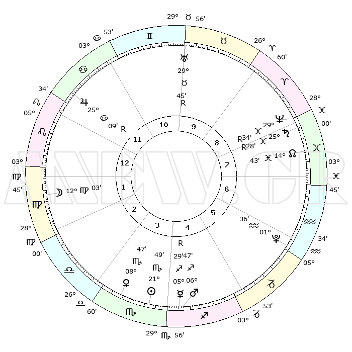 | | ΘΕΣΕΙΣ ΠΛΑΝΗΤΩΝ ΑΣΤΡΟΛΟΓΙΚΟΥ ΧΑΡΤΗ ΤΗΣ ΣΤΙΓΜΗΣ ΑΥΤΗΣ | | | | Πλανήτης | Ζώδιο | Μοίρες | Δεκαήμ. | Σε οίκο | Απόκλιση | | Ακμές των οίκων | | Ηλιος | Σκορπιός | 21°44' | Τρίτο | 4 | 18 S 12 | | 1ος | 13°00' | Λέων | | Σελήνη | Παρθένος | 11°09' | Δεύτερο | 2 | 07 N 48 | | 2ος | 05°07' | Παρθένος | | Ερμής | Τοξότης | 05°32'R | Πρώτο | 4 | 22 S 43 | | 3ος | 01°54' | Ζυγός | | Αφροδίτη | Σκορπιός | 08°42' | Πρώτο | 4 | 13 S 14 | | 4ος | 04°12' | Σκορπιός | | Αρης | Τοξότης | 06°44' | Πρώτο | 4 | 21 S 56 | | 5ος | 09°36' | Τοξότης | | Δίας | Καρκίνος | 25°09'R | Τρίτο | 12 | 21 N 13 | | 6ος | 13°21' | Αιγόκερως | | Κρόνος | Ιχθείς | 25°28'R | Τρίτο | 8 | 04 S 02 | | 7ος | 13°00' | Υδροχόος | | Ουρανός | Ταύρος | 29°45'R | Τρίτο | 10 | 19 N 53 | | 8ος | 05°07' | Ιχθείς | | Ποσειδώνας | Ιχθείς | 29°34'R | Τρίτο | 8 | 01 S 25 | | 9ος | 01°54' | Κριός | | Πλούτωνας | Υδροχόος | 01°36' | Πρώτο | 6 | 23 S 28 | | 10ος | 04°12' | Ταύρος | | Β. Δεσμός | Ιχθείς | 14°43' | Δεύτερο | 8 | 06 S 01 | | 11ος | 09°36' | Δίδυμοι | | Ωροσκόπος | Λέων | 13°00' | Δεύτερο | | | 12ος | 13°21' | Καρκίνος | | Μεσουράνημα | Ταύρος | 04°12' | Πρώτο | | | |