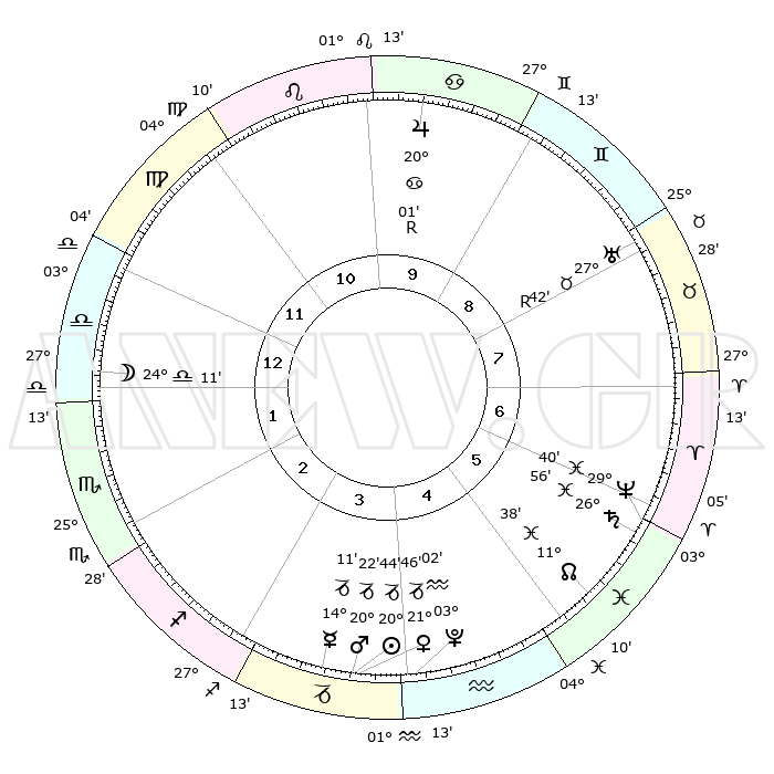 | | ΘΕΣΕΙΣ ΠΛΑΝΗΤΩΝ ΑΣΤΡΟΛΟΓΙΚΟΥ ΧΑΡΤΗ ΤΗΣ ΣΤΙΓΜΗΣ ΑΥΤΗΣ | | | | Πλανήτης | Ζώδιο | Μοίρες | Δεκαήμ. | Σε οίκο | Απόκλιση | | Ακμές των οίκων | | Ηλιος | Αιγόκερως | 20°04' | Τρίτο | 11 | 21 S 56 | | 1ος | 25°34' | Υδροχόος | | Σελήνη | Ζυγός | 16°17' | Δεύτερο | 8 | 09 S 11 | | 2ος | 11°15' | Κριός | | Ερμής | Αιγόκερως | 13°09' | Δεύτερο | 11 | 24 S 14 | | 3ος | 14°51' | Ταύρος | | Αφροδίτη | Αιγόκερως | 20°56' | Τρίτο | 11 | 22 S 38 | | 4ος | 09°43' | Δίδυμοι | | Αρης | Αιγόκερως | 19°52' | Δεύτερο | 11 | 22 S 54 | | 5ος | 01°26' | Καρκίνος | | Δίας | Καρκίνος | 20°06'R | Τρίτο | 5 | 22 N 11 | | 6ος | 24°33' | Καρκίνος | | Κρόνος | Ιχθείς | 26°54' | Τρίτο | 1 | 03 S 17 | | 7ος | 25°34' | Λέων | | Ουρανός | Ταύρος | 27°43'R | Τρίτο | 3 | 19 N 27 | | 8ος | 11°15' | Ζυγός | | Ποσειδώνας | Ιχθείς | 29°39' | Τρίτο | 1 | 01 S 21 | | 9ος | 14°51' | Σκορπιός | | Πλούτωνας | Υδροχόος | 03°01' | Πρώτο | 12 | 23 S 10 | | 10ος | 09°43' | Τοξότης | | Β. Δεσμός | Ιχθείς | 11°41' | Δεύτερο | 1 | 07 S 11 | | 11ος | 01°26' | Αιγόκερως | | Ωροσκόπος | Υδροχόος | 25°34' | Τρίτο | | | 12ος | 24°33' | Αιγόκερως | | Μεσουράνημα | Τοξότης | 09°43' | Πρώτο | | | |