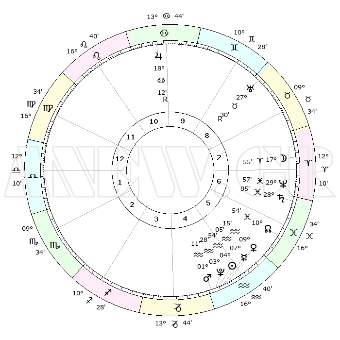 | | ΘΕΣΕΙΣ ΠΛΑΝΗΤΩΝ ΑΣΤΡΟΛΟΓΙΚΟΥ ΧΑΡΤΗ ΤΗΣ ΣΤΙΓΜΗΣ ΑΥΤΗΣ | | | | Πλανήτης | Ζώδιο | Μοίρες | Δεκαήμ. | Σε οίκο | Απόκλιση | | Ακμές των οίκων | | Ηλιος | Υδροχόος | 04°49' | Πρώτο | 5 | 19 S 03 | | 1ος | 21°18' | Παρθένος | | Σελήνη | Κριός | 16°57' | Δεύτερο | 7 | 09 N 36 | | 2ος | 17°12' | Ζυγός | | Ερμής | Υδροχόος | 06°58' | Πρώτο | 5 | 20 S 33 | | 3ος | 17°16' | Σκορπιός | | Αφροδίτη | Υδροχόος | 09°10' | Πρώτο | 5 | 19 S 09 | | 4ος | 20°12' | Τοξότης | | Αρης | Υδροχόος | 01°07' | Πρώτο | 5 | 20 S 54 | | 5ος | 23°21' | Αιγόκερως | | Δίας | Καρκίνος | 18°12'R | Δεύτερο | 10 | 22 N 29 | | 6ος | 24°07' | Υδροχόος | | Κρόνος | Ιχθείς | 28°05' | Τρίτο | 7 | 02 S 47 | | 7ος | 21°18' | Ιχθείς | | Ουρανός | Ταύρος | 27°30'R | Τρίτο | 9 | 19 N 25 | | 8ος | 17°12' | Κριός | | Ποσειδώνας | Ιχθείς | 29°57' | Τρίτο | 7 | 01 S 14 | | 9ος | 17°16' | Ταύρος | | Πλούτωνας | Υδροχόος | 03°28' | Πρώτο | 5 | 23 S 04 | | 10ος | 20°12' | Δίδυμοι | | Β. Δεσμός | Ιχθείς | 10°54' | Δεύτερο | 6 | 07 S 28 | | 11ος | 23°21' | Καρκίνος | | Ωροσκόπος | Παρθένος | 21°18' | Τρίτο | | | 12ος | 24°07' | Λέων | | Μεσουράνημα | Δίδυμοι | 20°12' | Τρίτο | | | |