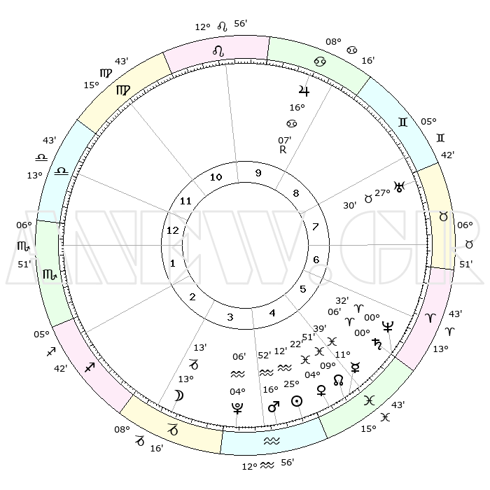 | | ΘΕΣΕΙΣ ΠΛΑΝΗΤΩΝ ΑΣΤΡΟΛΟΓΙΚΟΥ ΧΑΡΤΗ ΤΗΣ ΣΤΙΓΜΗΣ ΑΥΤΗΣ | | | | Πλανήτης | Ζώδιο | Μοίρες | Δεκαήμ. | Σε οίκο | Απόκλιση | | Ακμές των οίκων | | Ηλιος | Υδροχόος | 25°09' | Τρίτο | 5 | 13 S 08 | | 1ος | 17°49' | Ζυγός | | Σελήνη | Αιγόκερως | 12°25' | Δεύτερο | 3 | 27 S 14 | | 2ος | 15°32' | Σκορπιός | | Ερμής | Ιχθείς | 11°33' | Δεύτερο | 5 | 07 S 25 | | 3ος | 16°42' | Τοξότης | | Αφροδίτη | Ιχθείς | 04°17' | Πρώτο | 5 | 11 S 18 | | 4ος | 20°11' | Αιγόκερως | | Αρης | Υδροχόος | 16°49' | Δεύτερο | 4 | 16 S 49 | | 5ος | 23°08' | Υδροχόος | | Δίας | Καρκίνος | 16°07'R | Δεύτερο | 9 | 22 N 47 | | 6ος | 22°44' | Ιχθείς | | Κρόνος | Κριός | 00°06' | Πρώτο | 6 | 01 S 56 | | 7ος | 17°49' | Κριός | | Ουρανός | Ταύρος | 27°30' | Τρίτο | 8 | 19 N 25 | | 8ος | 15°32' | Ταύρος | | Ποσειδώνας | Κριός | 00°32' | Πρώτο | 6 | 01 S 00 | | 9ος | 16°42' | Δίδυμοι | | Πλούτωνας | Υδροχόος | 04°06' | Πρώτο | 4 | 22 S 57 | | 10ος | 20°11' | Καρκίνος | | Β. Δεσμός | Ιχθείς | 09°51' | Πρώτο | 5 | 07 S 53 | | 11ος | 23°08' | Λέων | | Ωροσκόπος | Ζυγός | 17°49' | Δεύτερο | | | 12ος | 22°44' | Παρθένος | | Μεσουράνημα | Καρκίνος | 20°11' | Τρίτο | | | |