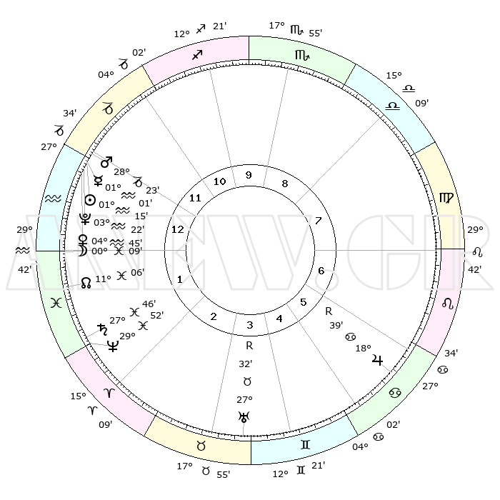 | | ΘΕΣΕΙΣ ΠΛΑΝΗΤΩΝ ΑΣΤΡΟΛΟΓΙΚΟΥ ΧΑΡΤΗ ΤΗΣ ΣΤΙΓΜΗΣ ΑΥΤΗΣ | | | | Πλανήτης | Ζώδιο | Μοίρες | Δεκαήμ. | Σε οίκο | Απόκλιση | | Ακμές των οίκων | | Ηλιος | Υδροχόος | 01°10' | Πρώτο | 1 | 19 S 54 | | 1ος | 22°17' | Αιγόκερως | | Σελήνη | Υδροχόος | 29°07' | Τρίτο | 1 | 12 S 39 | | 2ος | 04°55' | Ιχθείς | | Ερμής | Υδροχόος | 00°53' | Πρώτο | 1 | 21 S 57 | | 3ος | 14°24' | Κριός | | Αφροδίτη | Υδροχόος | 04°39' | Πρώτο | 1 | 20 S 13 | | 4ος | 14°15' | Ταύρος | | Αρης | Αιγόκερως | 28°19' | Τρίτο | 1 | 21 S 28 | | 5ος | 07°40' | Δίδυμοι | | Δίας | Καρκίνος | 18°40'R | Δεύτερο | 6 | 22 N 25 | | 6ος | 28°54' | Δίδυμοι | | Κρόνος | Ιχθείς | 27°45' | Τρίτο | 2 | 02 S 55 | | 7ος | 22°17' | Καρκίνος | | Ουρανός | Ταύρος | 27°32'R | Τρίτο | 4 | 19 N 25 | | 8ος | 04°55' | Παρθένος | | Ποσειδώνας | Ιχθείς | 29°52' | Τρίτο | 2 | 01 S 16 | | 9ος | 14°24' | Ζυγός | | Πλούτωνας | Υδροχόος | 03°21' | Πρώτο | 1 | 23 S 05 | | 10ος | 14°15' | Σκορπιός | | Β. Δεσμός | Ιχθείς | 11°06' | Δεύτερο | 2 | 07 S 24 | | 11ος | 07°40' | Τοξότης | | Ωροσκόπος | Αιγόκερως | 22°17' | Τρίτο | | | 12ος | 28°54' | Τοξότης | | Μεσουράνημα | Σκορπιός | 14°15' | Δεύτερο | | | |