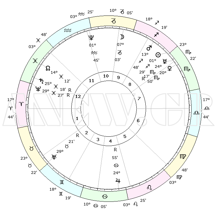 | | ΘΕΣΕΙΣ ΠΛΑΝΗΤΩΝ ΑΣΤΡΟΛΟΓΙΚΟΥ ΧΑΡΤΗ ΤΗΣ ΣΤΙΓΜΗΣ ΑΥΤΗΣ | | | | Πλανήτης | Ζώδιο | Μοίρες | Δεκαήμ. | Σε οίκο | Απόκλιση | | Ακμές των οίκων | | Ηλιος | Τοξότης | 01°25' | Πρώτο | 9 | 20 S 26 | | 1ος | 06°11' | Ιχθείς | | Σελήνη | Αιγόκερως | 06°11' | Πρώτο | 10 | 27 S 57 | | 2ος | 20°59' | Κριός | | Ερμής | Σκορπιός | 24°22'R | Τρίτο | 9 | 17 S 24 | | 3ος | 22°30' | Ταύρος | | Αφροδίτη | Σκορπιός | 20°45' | Τρίτο | 8 | 17 S 00 | | 4ος | 16°19' | Δίδυμοι | | Αρης | Τοξότης | 13°45' | Δεύτερο | 9 | 23 S 02 | | 5ος | 08°01' | Καρκίνος | | Δίας | Καρκίνος | 24°55'R | Τρίτο | 5 | 21 N 17 | | 6ος | 02°14' | Λέων | | Κρόνος | Ιχθείς | 25°18'R | Τρίτο | 1 | 04 S 04 | | 7ος | 06°11' | Παρθένος | | Ουρανός | Ταύρος | 29°21'R | Τρίτο | 3 | 19 N 48 | | 8ος | 20°59' | Ζυγός | | Ποσειδώνας | Ιχθείς | 29°27'R | Τρίτο | 1 | 01 S 28 | | 9ος | 22°30' | Σκορπιός | | Πλούτωνας | Υδροχόος | 01°45' | Πρώτο | 11 | 23 S 26 | | 10ος | 16°19' | Τοξότης | | Β. Δεσμός | Ιχθείς | 14°13' | Δεύτερο | 1 | 06 S 13 | | 11ος | 08°01' | Αιγόκερως | | Ωροσκόπος | Ιχθείς | 06°11' | Πρώτο | | | 12ος | 02°14' | Υδροχόος | | Μεσουράνημα | Τοξότης | 16°19' | Δεύτερο | | | |