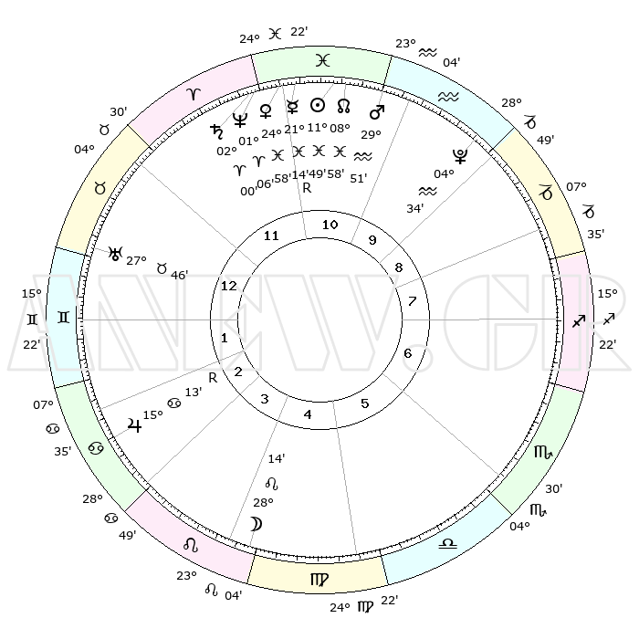 | | ΘΕΣΕΙΣ ΠΛΑΝΗΤΩΝ ΑΣΤΡΟΛΟΓΙΚΟΥ ΧΑΡΤΗ ΤΗΣ ΣΤΙΓΜΗΣ ΑΥΤΗΣ | | | | Πλανήτης | Ζώδιο | Μοίρες | Δεκαήμ. | Σε οίκο | Απόκλιση | | Ακμές των οίκων | | Ηλιος | Ιχθείς | 11°44' | Δεύτερο | 11 | 07 S 09 | | 1ος | 16°06' | Ταύρος | | Σελήνη | Λέων | 27°17' | Τρίτο | 5 | 13 N 25 | | 2ος | 14°04' | Δίδυμοι | | Ερμής | Ιχθείς | 21°17'R | Τρίτο | 11 | 00 S 15 | | 3ος | 06°13' | Καρκίνος | | Αφροδίτη | Ιχθείς | 24°53' | Τρίτο | 11 | 03 S 16 | | 4ος | 28°14' | Καρκίνος | | Αρης | Υδροχόος | 29°48' | Τρίτο | 11 | 12 S 34 | | 5ος | 24°32' | Λέων | | Δίας | Καρκίνος | 15°13'R | Δεύτερο | 3 | 22 N 55 | | 6ος | 00°28' | Ζυγός | | Κρόνος | Κριός | 01°60' | Πρώτο | 12 | 01 S 10 | | 7ος | 16°06' | Σκορπιός | | Ουρανός | Ταύρος | 27°46' | Τρίτο | 1 | 19 N 29 | | 8ος | 14°04' | Τοξότης | | Ποσειδώνας | Κριός | 01°06' | Πρώτο | 12 | 00 S 46 | | 9ος | 06°13' | Αιγόκερως | | Πλούτωνας | Υδροχόος | 04°34' | Πρώτο | 10 | 22 S 52 | | 10ος | 28°14' | Αιγόκερως | | Β. Δεσμός | Ιχθείς | 08°59' | Πρώτο | 11 | 08 S 12 | | 11ος | 24°32' | Υδροχόος | | Ωροσκόπος | Ταύρος | 16°06' | Δεύτερο | | | 12ος | 00°28' | Κριός | | Μεσουράνημα | Αιγόκερως | 28°14' | Τρίτο | | | |