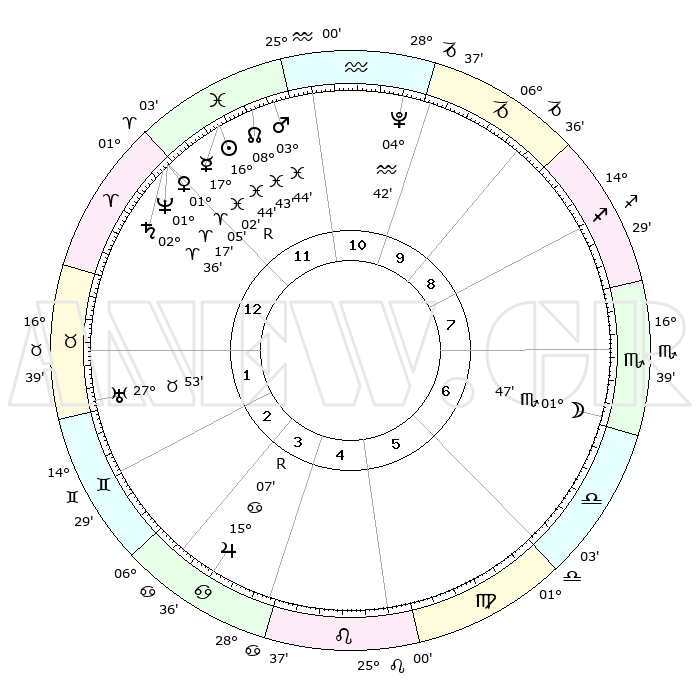 | | ΘΕΣΕΙΣ ΠΛΑΝΗΤΩΝ ΑΣΤΡΟΛΟΓΙΚΟΥ ΧΑΡΤΗ ΤΗΣ ΣΤΙΓΜΗΣ ΑΥΤΗΣ | | | | Πλανήτης | Ζώδιο | Μοίρες | Δεκαήμ. | Σε οίκο | Απόκλιση | | Ακμές των οίκων | | Ηλιος | Ιχθείς | 16°41' | Δεύτερο | 12 | 05 S 15 | | 1ος | 14°06' | Κριός | | Σελήνη | Σκορπιός | 01°02' | Πρώτο | 7 | 15 S 43 | | 2ος | 20°44' | Ταύρος | | Ερμής | Ιχθείς | 17°05'R | Δεύτερο | 12 | 01 S 44 | | 3ος | 16°08' | Δίδυμοι | | Αφροδίτη | Κριός | 01°01' | Πρώτο | 12 | 00 S 44 | | 4ος | 07°59' | Καρκίνος | | Αρης | Ιχθείς | 03°41' | Πρώτο | 12 | 11 S 11 | | 5ος | 01°04' | Λέων | | Δίας | Καρκίνος | 15°07'R | Δεύτερο | 4 | 22 N 56 | | 6ος | 00°48' | Παρθένος | | Κρόνος | Κριός | 02°36' | Πρώτο | 12 | 00 S 55 | | 7ος | 14°06' | Ζυγός | | Ουρανός | Ταύρος | 27°53' | Τρίτο | 2 | 19 N 31 | | 8ος | 20°44' | Σκορπιός | | Ποσειδώνας | Κριός | 01°17' | Πρώτο | 12 | 00 S 41 | | 9ος | 16°08' | Τοξότης | | Πλούτωνας | Υδροχόος | 04°42' | Πρώτο | 11 | 22 S 51 | | 10ος | 07°59' | Αιγόκερως | | Β. Δεσμός | Ιχθείς | 08°43' | Πρώτο | 12 | 08 S 18 | | 11ος | 01°04' | Υδροχόος | | Ωροσκόπος | Κριός | 14°06' | Δεύτερο | | | 12ος | 00°48' | Ιχθείς | | Μεσουράνημα | Αιγόκερως | 07°59' | Πρώτο | | | |