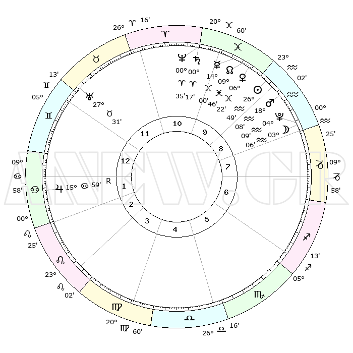 | | ΘΕΣΕΙΣ ΠΛΑΝΗΤΩΝ ΑΣΤΡΟΛΟΓΙΚΟΥ ΧΑΡΤΗ ΤΗΣ ΣΤΙΓΜΗΣ ΑΥΤΗΣ | | | | Πλανήτης | Ζώδιο | Μοίρες | Δεκαήμ. | Σε οίκο | Απόκλιση | | Ακμές των οίκων | | Ηλιος | Υδροχόος | 26°45' | Τρίτο | 10 | 12 S 36 | | 1ος | 14°36' | Δίδυμοι | | Σελήνη | Υδροχόος | 02°09' | Πρώτο | 9 | 22 S 45 | | 2ος | 06°55' | Καρκίνος | | Ερμής | Ιχθείς | 13°54' | Δεύτερο | 10 | 06 S 12 | | 3ος | 28°08' | Καρκίνος | | Αφροδίτη | Ιχθείς | 06°16' | Πρώτο | 10 | 10 S 34 | | 4ος | 22°18' | Λέων | | Αρης | Υδροχόος | 18°04' | Δεύτερο | 9 | 16 S 26 | | 5ος | 23°27' | Παρθένος | | Δίας | Καρκίνος | 15°60'R | Δεύτερο | 2 | 22 N 48 | | 6ος | 03°32' | Σκορπιός | | Κρόνος | Κριός | 00°16' | Πρώτο | 11 | 01 S 52 | | 7ος | 14°36' | Τοξότης | | Ουρανός | Ταύρος | 27°31' | Τρίτο | 12 | 19 N 25 | | 8ος | 06°55' | Αιγόκερως | | Ποσειδώνας | Κριός | 00°35' | Πρώτο | 11 | 00 S 58 | | 9ος | 28°08' | Αιγόκερως | | Πλούτωνας | Υδροχόος | 04°09' | Πρώτο | 9 | 22 S 56 | | 10ος | 22°18' | Υδροχόος | | Β. Δεσμός | Ιχθείς | 09°46' | Πρώτο | 10 | 07 S 54 | | 11ος | 23°27' | Ιχθείς | | Ωροσκόπος | Δίδυμοι | 14°36' | Δεύτερο | | | 12ος | 03°32' | Ταύρος | | Μεσουράνημα | Υδροχόος | 22°18' | Τρίτο | | | |
