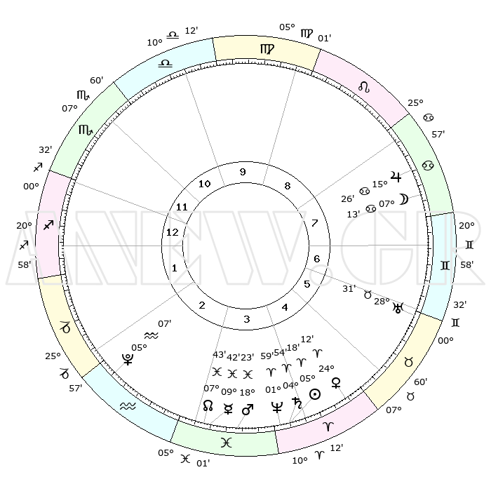 | | ΘΕΣΕΙΣ ΠΛΑΝΗΤΩΝ ΑΣΤΡΟΛΟΓΙΚΟΥ ΧΑΡΤΗ ΤΗΣ ΣΤΙΓΜΗΣ ΑΥΤΗΣ | | | | Πλανήτης | Ζώδιο | Μοίρες | Δεκαήμ. | Σε οίκο | Απόκλιση | | Ακμές των οίκων | | Ηλιος | Κριός | 05°14' | Πρώτο | 4 | 02 N 05 | | 1ος | 02°31' | Τοξότης | | Σελήνη | Καρκίνος | 06°21' | Πρώτο | 8 | 27 N 55 | | 2ος | 03°60' | Αιγόκερως | | Ερμής | Ιχθείς | 09°41' | Πρώτο | 3 | 08 S 06 | | 3ος | 10°07' | Υδροχόος | | Αφροδίτη | Κριός | 24°07' | Τρίτο | 5 | 08 N 43 | | 4ος | 16°12' | Ιχθείς | | Αρης | Ιχθείς | 18°20' | Δεύτερο | 4 | 05 S 35 | | 5ος | 16°55' | Κριός | | Δίας | Καρκίνος | 15°26' | Δεύτερο | 8 | 22 N 54 | | 6ος | 11°38' | Ταύρος | | Κρόνος | Κριός | 04°54' | Πρώτο | 4 | 00 S 00 | | 7ος | 02°31' | Δίδυμοι | | Ουρανός | Ταύρος | 28°31' | Τρίτο | 6 | 19 N 39 | | 8ος | 03°60' | Καρκίνος | | Ποσειδώνας | Κριός | 01°59' | Πρώτο | 4 | 00 S 25 | | 9ος | 10°07' | Λέων | | Πλούτωνας | Υδροχόος | 05°07' | Πρώτο | 2 | 22 S 48 | | 10ος | 16°12' | Παρθένος | | Β. Δεσμός | Ιχθείς | 07°44' | Πρώτο | 3 | 08 S 40 | | 11ος | 16°55' | Ζυγός | | Ωροσκόπος | Τοξότης | 02°31' | Πρώτο | | | 12ος | 11°38' | Σκορπιός | | Μεσουράνημα | Παρθένος | 16°12' | Δεύτερο | | | |