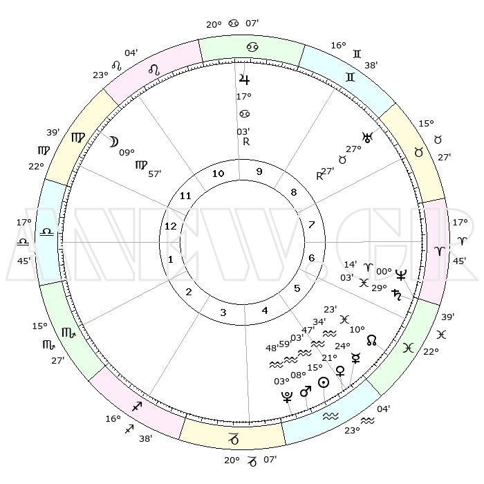 | | ΘΕΣΕΙΣ ΠΛΑΝΗΤΩΝ ΑΣΤΡΟΛΟΓΙΚΟΥ ΧΑΡΤΗ ΤΗΣ ΣΤΙΓΜΗΣ ΑΥΤΗΣ | | | | Πλανήτης | Ζώδιο | Μοίρες | Δεκαήμ. | Σε οίκο | Απόκλιση | | Ακμές των οίκων | | Ηλιος | Υδροχόος | 14°59' | Δεύτερο | 5 | 16 S 20 | | 1ος | 00°10' | Ζυγός | | Σελήνη | Παρθένος | 09°09' | Πρώτο | 12 | 08 N 08 | | 2ος | 26°46' | Ζυγός | | Ερμής | Υδροχόος | 24°28' | Τρίτο | 5 | 14 S 56 | | 3ος | 27°12' | Σκορπιός | | Αφροδίτη | Υδροχόος | 21°43' | Τρίτο | 5 | 15 S 35 | | 4ος | 00°11' | Αιγόκερως | | Αρης | Υδροχόος | 08°56' | Πρώτο | 5 | 19 S 02 | | 5ος | 03°10' | Υδροχόος | | Δίας | Καρκίνος | 17°03'R | Δεύτερο | 10 | 22 N 39 | | 6ος | 03°35' | Ιχθείς | | Κρόνος | Ιχθείς | 29°02' | Τρίτο | 6 | 02 S 22 | | 7ος | 00°10' | Κριός | | Ουρανός | Ταύρος | 27°27'R | Τρίτο | 9 | 19 N 24 | | 8ος | 26°46' | Κριός | | Ποσειδώνας | Κριός | 00°13' | Πρώτο | 7 | 01 S 07 | | 9ος | 27°12' | Ταύρος | | Πλούτωνας | Υδροχόος | 03°47' | Πρώτο | 5 | 23 S 00 | | 10ος | 00°11' | Καρκίνος | | Β. Δεσμός | Ιχθείς | 10°23' | Δεύτερο | 6 | 07 S 40 | | 11ος | 03°10' | Λέων | | Ωροσκόπος | Ζυγός | 00°10' | Πρώτο | | | 12ος | 03°35' | Παρθένος | | Μεσουράνημα | Καρκίνος | 00°11' | Πρώτο | | | |