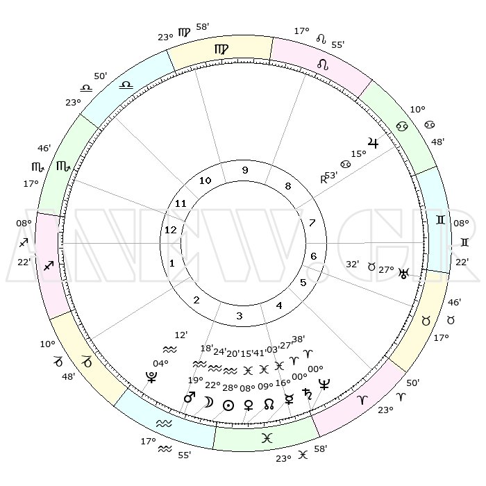 | | ΘΕΣΕΙΣ ΠΛΑΝΗΤΩΝ ΑΣΤΡΟΛΟΓΙΚΟΥ ΧΑΡΤΗ ΤΗΣ ΣΤΙΓΜΗΣ ΑΥΤΗΣ | | | | Πλανήτης | Ζώδιο | Μοίρες | Δεκαήμ. | Σε οίκο | Απόκλιση | | Ακμές των οίκων | | Ηλιος | Υδροχόος | 28°16' | Τρίτο | 4 | 12 S 04 | | 1ος | 16°27' | Σκορπιός | | Σελήνη | Υδροχόος | 21°26' | Τρίτο | 3 | 15 S 52 | | 2ος | 16°04' | Τοξότης | | Ερμής | Ιχθείς | 15°57' | Δεύτερο | 4 | 05 S 05 | | 3ος | 19°44' | Αιγόκερως | | Αφροδίτη | Ιχθείς | 08°09' | Πρώτο | 4 | 09 S 52 | | 4ος | 25°06' | Υδροχόος | | Αρης | Υδροχόος | 19°15' | Δεύτερο | 3 | 16 S 04 | | 5ος | 27°26' | Ιχθείς | | Δίας | Καρκίνος | 15°53'R | Δεύτερο | 8 | 22 N 49 | | 6ος | 24°18' | Κριός | | Κρόνος | Κριός | 00°26' | Πρώτο | 5 | 01 S 48 | | 7ος | 16°27' | Ταύρος | | Ουρανός | Ταύρος | 27°32' | Τρίτο | 7 | 19 N 26 | | 8ος | 16°04' | Δίδυμοι | | Ποσειδώνας | Κριός | 00°38' | Πρώτο | 5 | 00 S 57 | | 9ος | 19°44' | Καρκίνος | | Πλούτωνας | Υδροχόος | 04°12' | Πρώτο | 3 | 22 S 56 | | 10ος | 25°06' | Λέων | | Β. Δεσμός | Ιχθείς | 09°41' | Πρώτο | 4 | 07 S 56 | | 11ος | 27°26' | Παρθένος | | Ωροσκόπος | Σκορπιός | 16°27' | Δεύτερο | | | 12ος | 24°18' | Ζυγός | | Μεσουράνημα | Λέων | 25°06' | Τρίτο | | | |