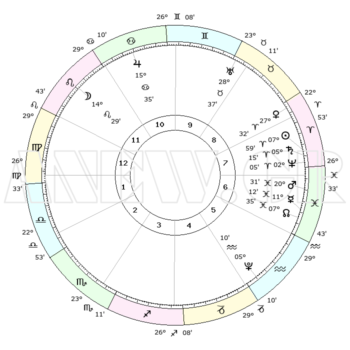 | | ΘΕΣΕΙΣ ΠΛΑΝΗΤΩΝ ΑΣΤΡΟΛΟΓΙΚΟΥ ΧΑΡΤΗ ΤΗΣ ΣΤΙΓΜΗΣ ΑΥΤΗΣ | | | | Πλανήτης | Ζώδιο | Μοίρες | Δεκαήμ. | Σε οίκο | Απόκλιση | | Ακμές των οίκων | | Ηλιος | Κριός | 07°55' | Πρώτο | 8 | 03 N 08 | | 1ος | 07°22' | Παρθένος | | Σελήνη | Λέων | 13°36' | Δεύτερο | 12 | 18 N 52 | | 2ος | 01°59' | Ζυγός | | Ερμής | Ιχθείς | 11°09' | Δεύτερο | 7 | 08 S 03 | | 3ος | 01°15' | Σκορπιός | | Αφροδίτη | Κριός | 27°27' | Τρίτο | 8 | 10 N 01 | | 4ος | 04°12' | Τοξότης | | Αρης | Ιχθείς | 20°27' | Τρίτο | 7 | 04 S 45 | | 5ος | 07°56' | Αιγόκερως | | Δίας | Καρκίνος | 15°35' | Δεύτερο | 11 | 22 N 53 | | 6ος | 09°23' | Υδροχόος | | Κρόνος | Κριός | 05°14' | Πρώτο | 8 | 00 N 08 | | 7ος | 07°22' | Ιχθείς | | Ουρανός | Ταύρος | 28°37' | Τρίτο | 9 | 19 N 41 | | 8ος | 01°59' | Κριός | | Ποσειδώνας | Κριός | 02°05' | Πρώτο | 8 | 00 S 22 | | 9ος | 01°15' | Ταύρος | | Πλούτωνας | Υδροχόος | 05°10' | Πρώτο | 5 | 22 S 48 | | 10ος | 04°12' | Δίδυμοι | | Β. Δεσμός | Ιχθείς | 07°35' | Πρώτο | 7 | 08 S 43 | | 11ος | 07°56' | Καρκίνος | | Ωροσκόπος | Παρθένος | 07°22' | Πρώτο | | | 12ος | 09°23' | Λέων | | Μεσουράνημα | Δίδυμοι | 04°12' | Πρώτο | | | |