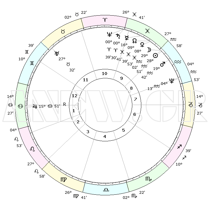 | | ΘΕΣΕΙΣ ΠΛΑΝΗΤΩΝ ΑΣΤΡΟΛΟΓΙΚΟΥ ΧΑΡΤΗ ΤΗΣ ΣΤΙΓΜΗΣ ΑΥΤΗΣ | | | | Πλανήτης | Ζώδιο | Μοίρες | Δεκαήμ. | Σε οίκο | Απόκλιση | | Ακμές των οίκων | | Ηλιος | Υδροχόος | 28°46' | Τρίτο | 10 | 11 S 54 | | 1ος | 18°53' | Δίδυμοι | | Σελήνη | Υδροχόος | 28°01' | Τρίτο | 10 | 13 S 06 | | 2ος | 10°40' | Καρκίνος | | Ερμής | Ιχθείς | 16°35' | Δεύτερο | 10 | 04 S 44 | | 3ος | 01°58' | Λέων | | Αφροδίτη | Ιχθείς | 08°47' | Πρώτο | 10 | 09 S 38 | | 4ος | 26°39' | Λέων | | Αρης | Υδροχόος | 19°39' | Δεύτερο | 9 | 15 S 57 | | 5ος | 28°38' | Παρθένος | | Δίας | Καρκίνος | 15°51'R | Δεύτερο | 2 | 22 N 49 | | 6ος | 08°54' | Σκορπιός | | Κρόνος | Κριός | 00°30' | Πρώτο | 11 | 01 S 46 | | 7ος | 18°53' | Τοξότης | | Ουρανός | Ταύρος | 27°32' | Τρίτο | 12 | 19 N 26 | | 8ος | 10°40' | Αιγόκερως | | Ποσειδώνας | Κριός | 00°39' | Πρώτο | 11 | 00 S 57 | | 9ος | 01°58' | Υδροχόος | | Πλούτωνας | Υδροχόος | 04°12' | Πρώτο | 9 | 22 S 56 | | 10ος | 26°39' | Υδροχόος | | Β. Δεσμός | Ιχθείς | 09°39' | Πρώτο | 10 | 07 S 57 | | 11ος | 28°38' | Ιχθείς | | Ωροσκόπος | Δίδυμοι | 18°53' | Δεύτερο | | | 12ος | 08°54' | Ταύρος | | Μεσουράνημα | Υδροχόος | 26°39' | Τρίτο | | | |