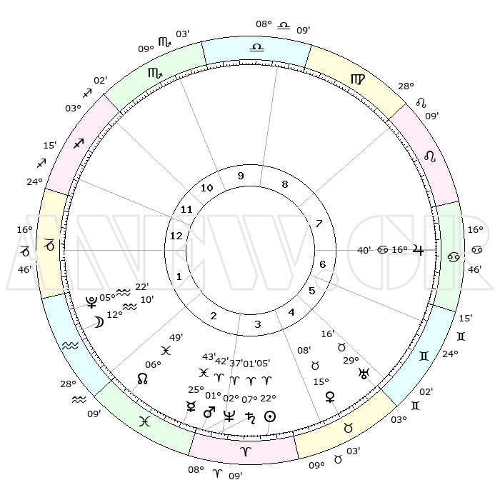 | | ΘΕΣΕΙΣ ΠΛΑΝΗΤΩΝ ΑΣΤΡΟΛΟΓΙΚΟΥ ΧΑΡΤΗ ΤΗΣ ΣΤΙΓΜΗΣ ΑΥΤΗΣ | | | | Πλανήτης | Ζώδιο | Μοίρες | Δεκαήμ. | Σε οίκο | Απόκλιση | | Ακμές των οίκων | | Ηλιος | Κριός | 22°02' | Τρίτο | 4 | 08 N 35 | | 1ος | 28°44' | Τοξότης | | Σελήνη | Υδροχόος | 11°32' | Δεύτερο | 2 | 19 S 33 | | 2ος | 05°34' | Υδροχόος | | Ερμής | Ιχθείς | 25°39' | Τρίτο | 3 | 03 S 59 | | 3ος | 15°28' | Ιχθείς | | Αφροδίτη | Ταύρος | 15°04' | Δεύτερο | 4 | 16 N 23 | | 4ος | 19°37' | Κριός | | Αρης | Κριός | 01°39' | Πρώτο | 3 | 00 S 16 | | 5ος | 16°08' | Ταύρος | | Δίας | Καρκίνος | 16°40' | Δεύτερο | 7 | 22 N 46 | | 6ος | 08°01' | Δίδυμοι | | Κρόνος | Κριός | 07°01' | Πρώτο | 3 | 00 N 49 | | 7ος | 28°44' | Δίδυμοι | | Ουρανός | Ταύρος | 29°16' | Τρίτο | 5 | 19 N 49 | | 8ος | 05°34' | Λέων | | Ποσειδώνας | Κριός | 02°37' | Πρώτο | 3 | 00 S 10 | | 9ος | 15°28' | Παρθένος | | Πλούτωνας | Υδροχόος | 05°22' | Πρώτο | 1 | 22 S 47 | | 10ος | 19°37' | Ζυγός | | Β. Δεσμός | Ιχθείς | 06°49' | Πρώτο | 2 | 09 S 00 | | 11ος | 16°08' | Σκορπιός | | Ωροσκόπος | Τοξότης | 28°44' | Τρίτο | | | 12ος | 08°01' | Τοξότης | | Μεσουράνημα | Ζυγός | 19°37' | Δεύτερο | | | |